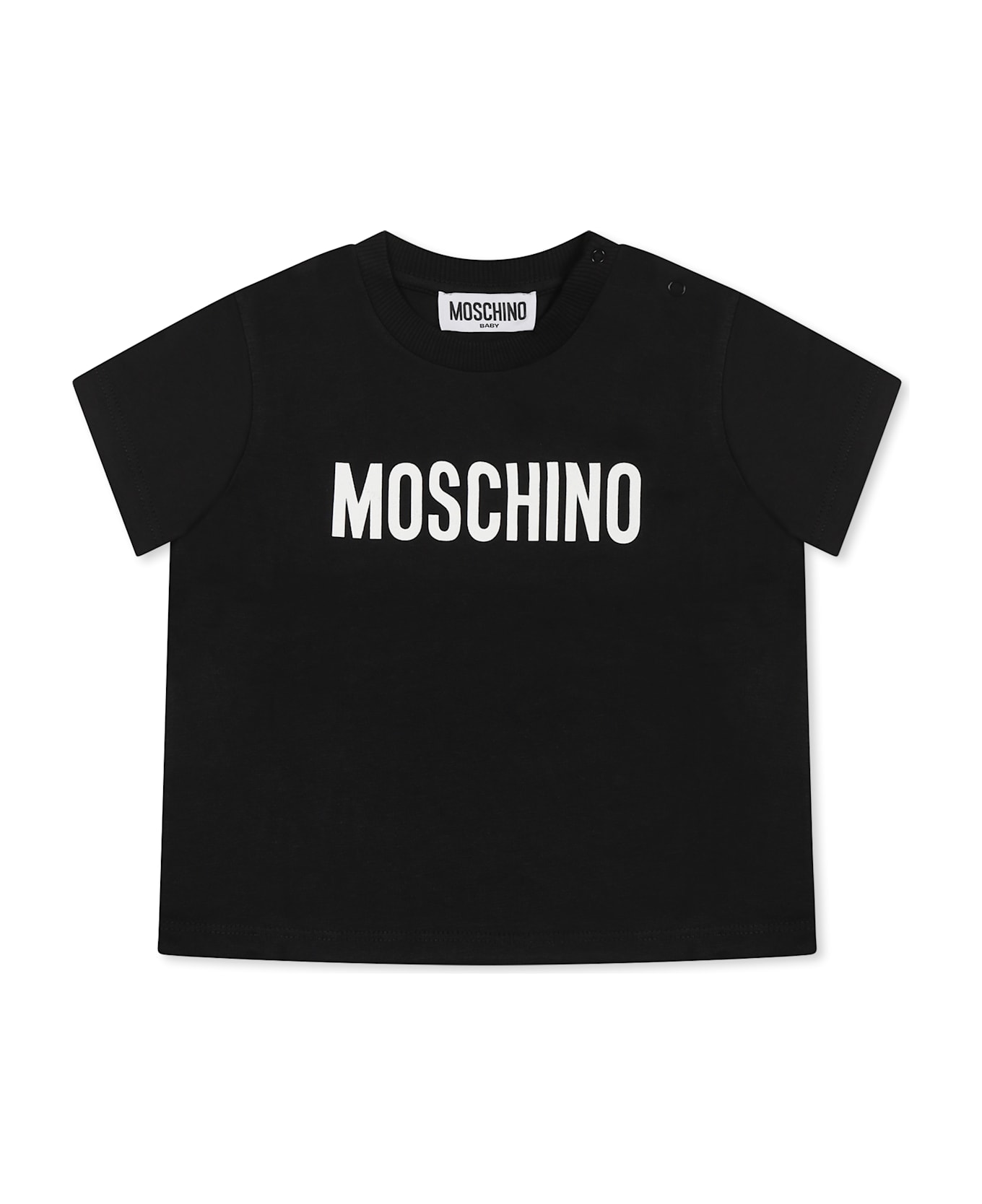 Black t-shirt from the Moschino Kids brand, made of cotton, with short sleeves, ribbed crew neck and snap button closure on the shoulder. It is embellished with contrasting white logo on the front.