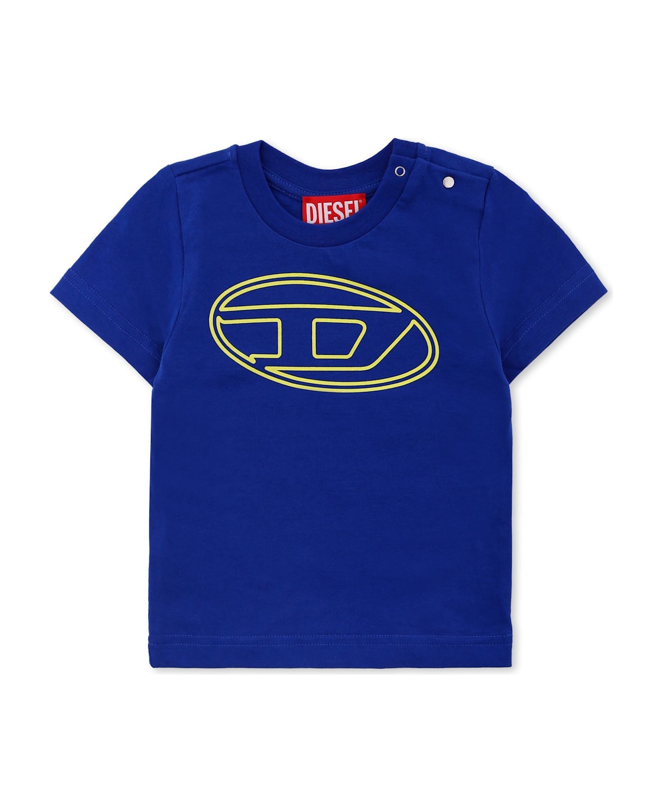 Blue cotton t-shirt, short sleeves, with ribbed crew neck and snap button fastening on the shoulder. It is embellished with yellow logo print on the front.
