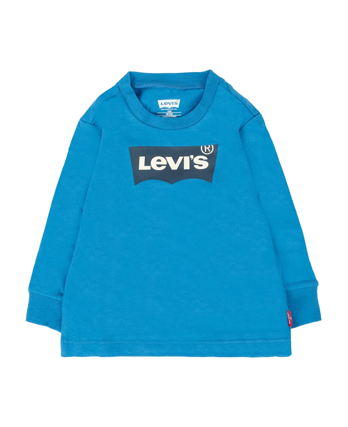 Light blue cotton t-shirt, long sleeves, with ribbed crew neck and crew neck; snap button fastening on the shoulder. It is embellished with a contrasting logo print on the front.