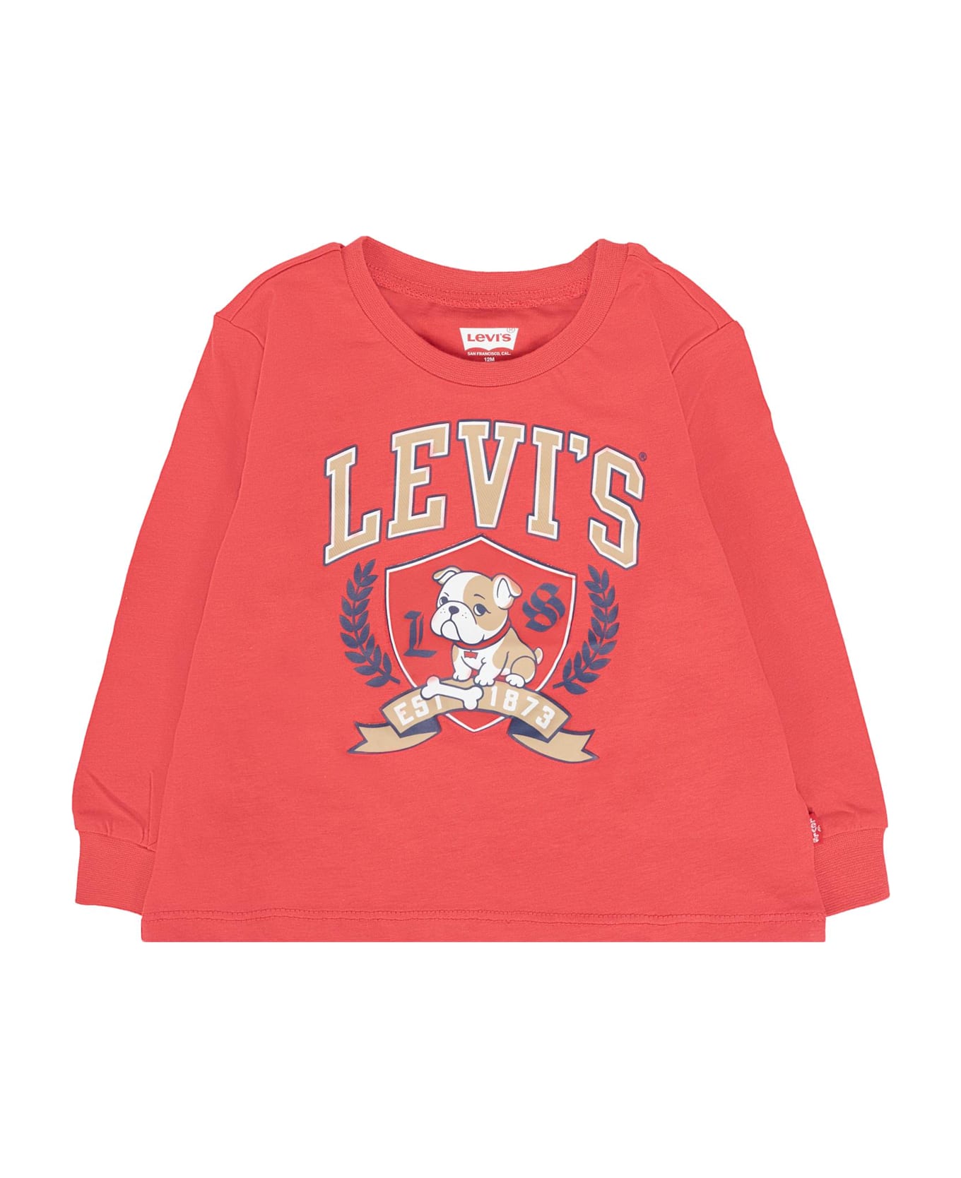 Red cotton T-shirt with long sleeves, crew neck, ribbed hem, and ribbed cuffs. It is decorated with a logo and dog on the front.