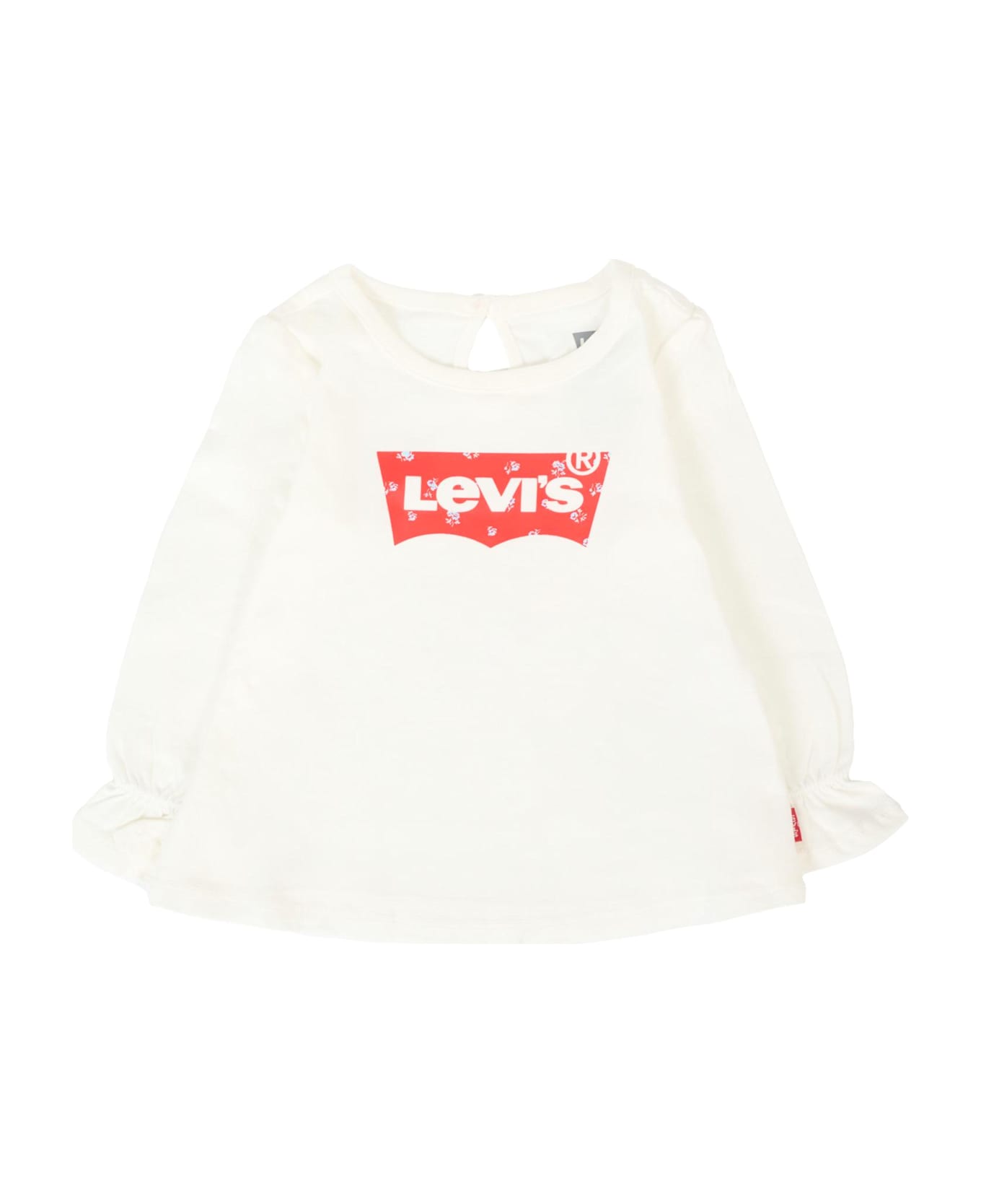 White cotton T-shirt with long sleeves, ribbed crew neck and hem, button closure on the back. It is embellished with logo and flowers on the front and logo patch on the side.