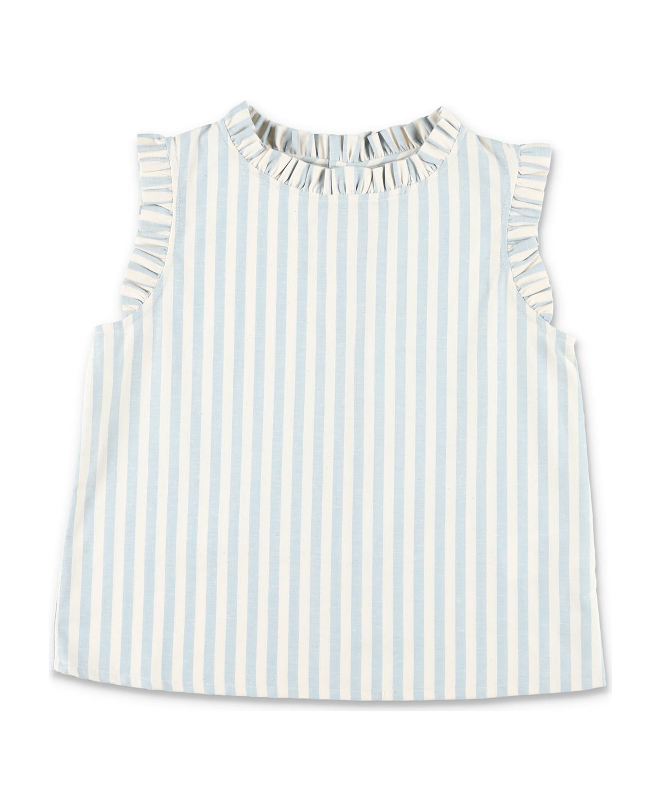 Cotton Lou Striped Blouse By Bonpoint. Featuring: Round Neck Sleeveless Back Button Fastening Two-tone Vertical Stripes Pattern Ruffled Edges Straight Cut