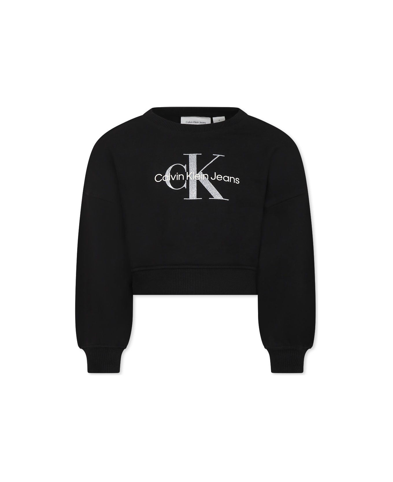 Black crop sweatshirt, in brushed cotton, with long sleeves, crew neck, cuffs and hem in ribs; made with 95% regenerated cotton. It is embellished with rubberized logo and lurex monogram on the front.