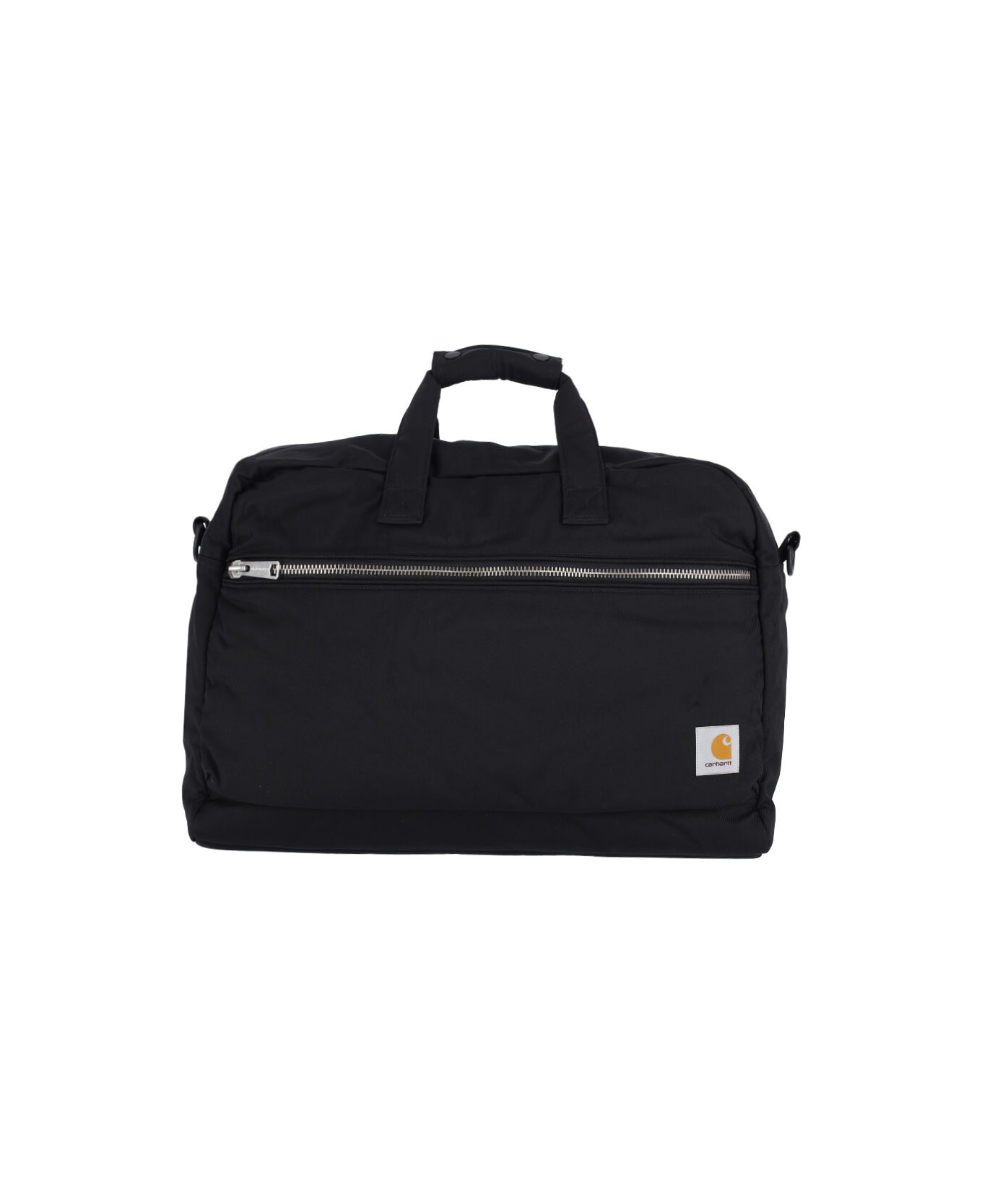 Carhartt WIP "Leroy" black nylon duffle bag with two top handles, adjustable and removable shoulder strap, double zip closure, maxi front zip pocket, multicolor logo patch on the front, inner zip pocket, main inner compartment. Composition: 100% Nylon