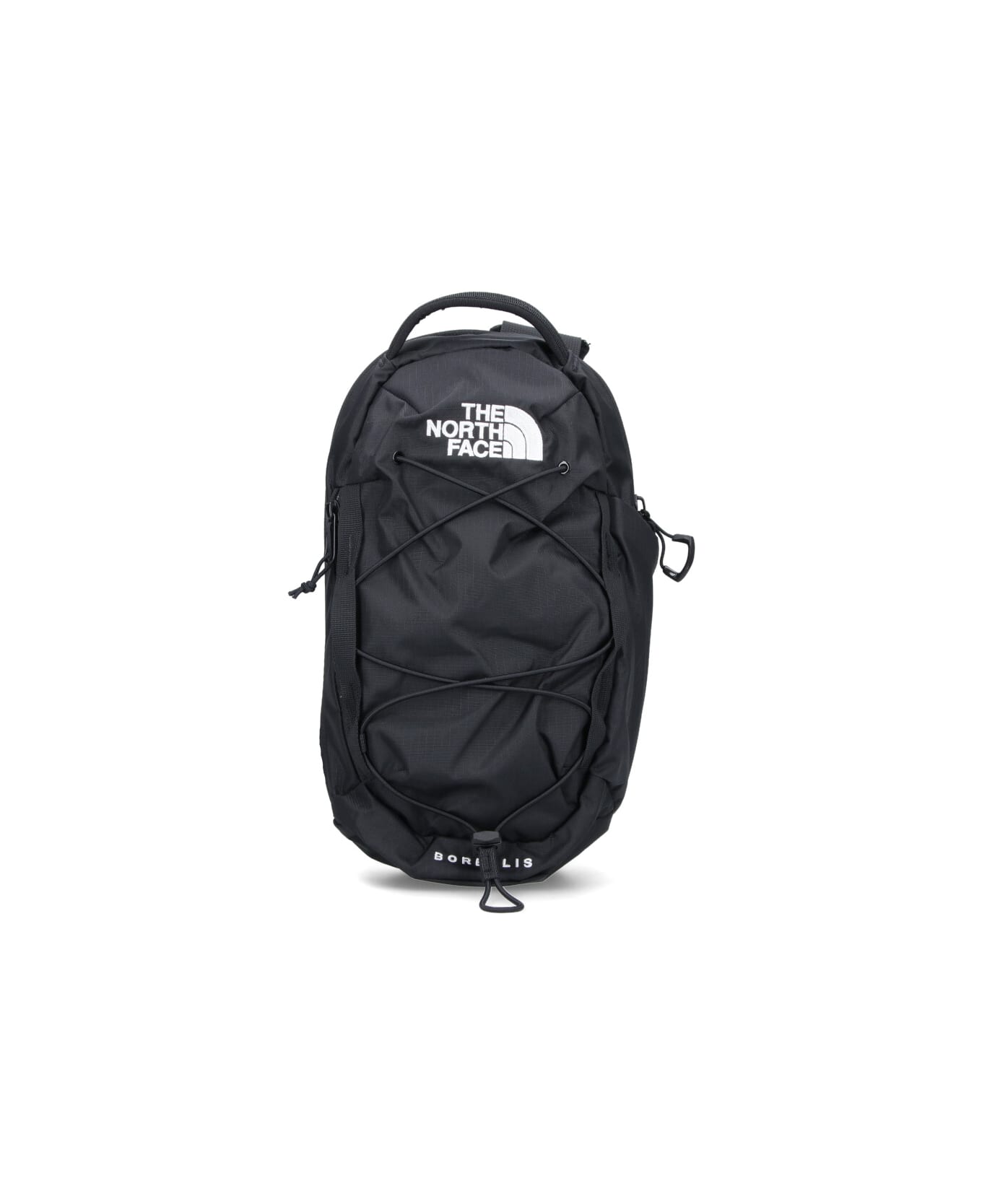 The North Face 'Borealis' black nylon mini backpack with top handle, back zip pouch shoulder strap, zip closure, contrast logo embroidery at the front, drawstring detail at the front, side flat pocket, inner slip pocket, inner zip pocket, main inner compartment.