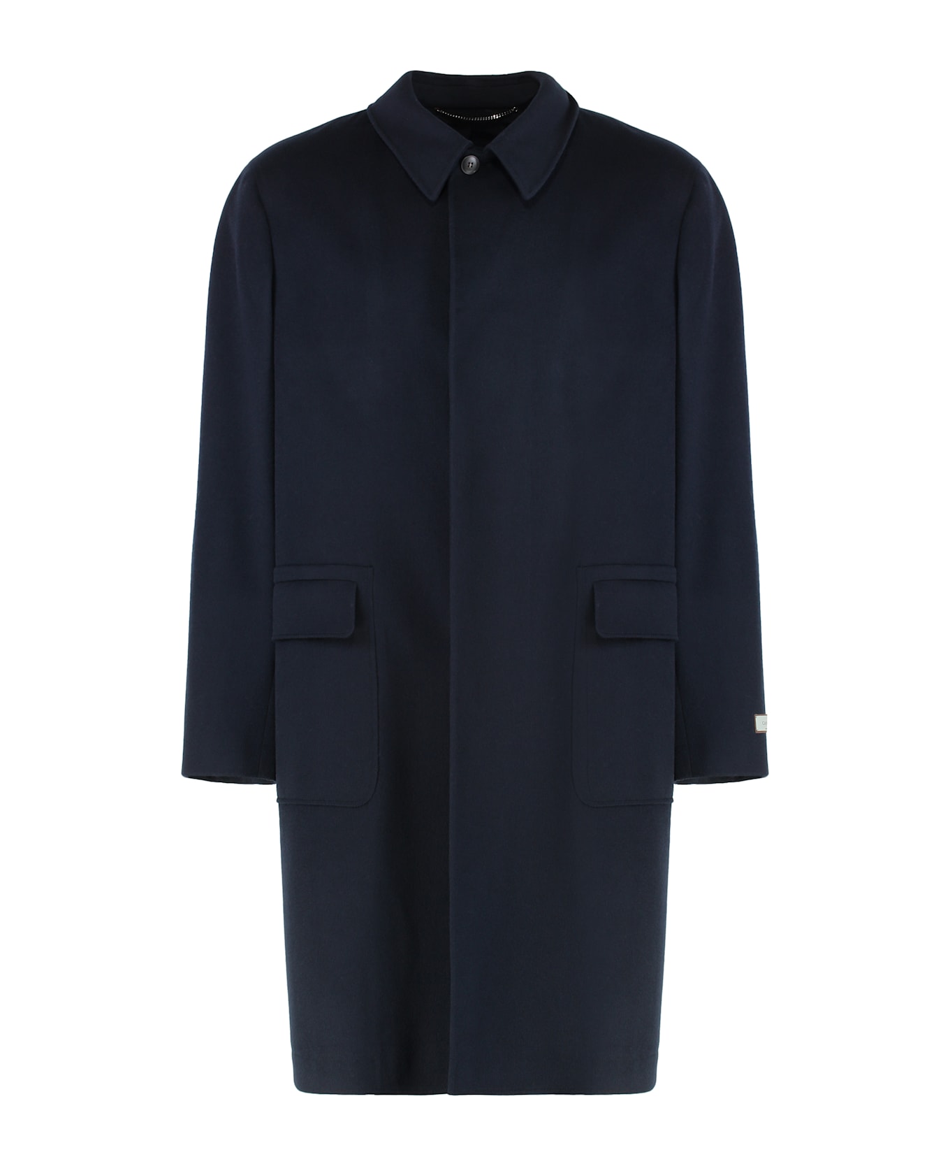 Coat in an elegant navy color, characterized by a minimalist design. it features a classic collar and two flap pockets, offering a comfortable and versatile fit. ideal for both casual and formal outfits, it is made with high-quality materials to ensure comfort and durability.