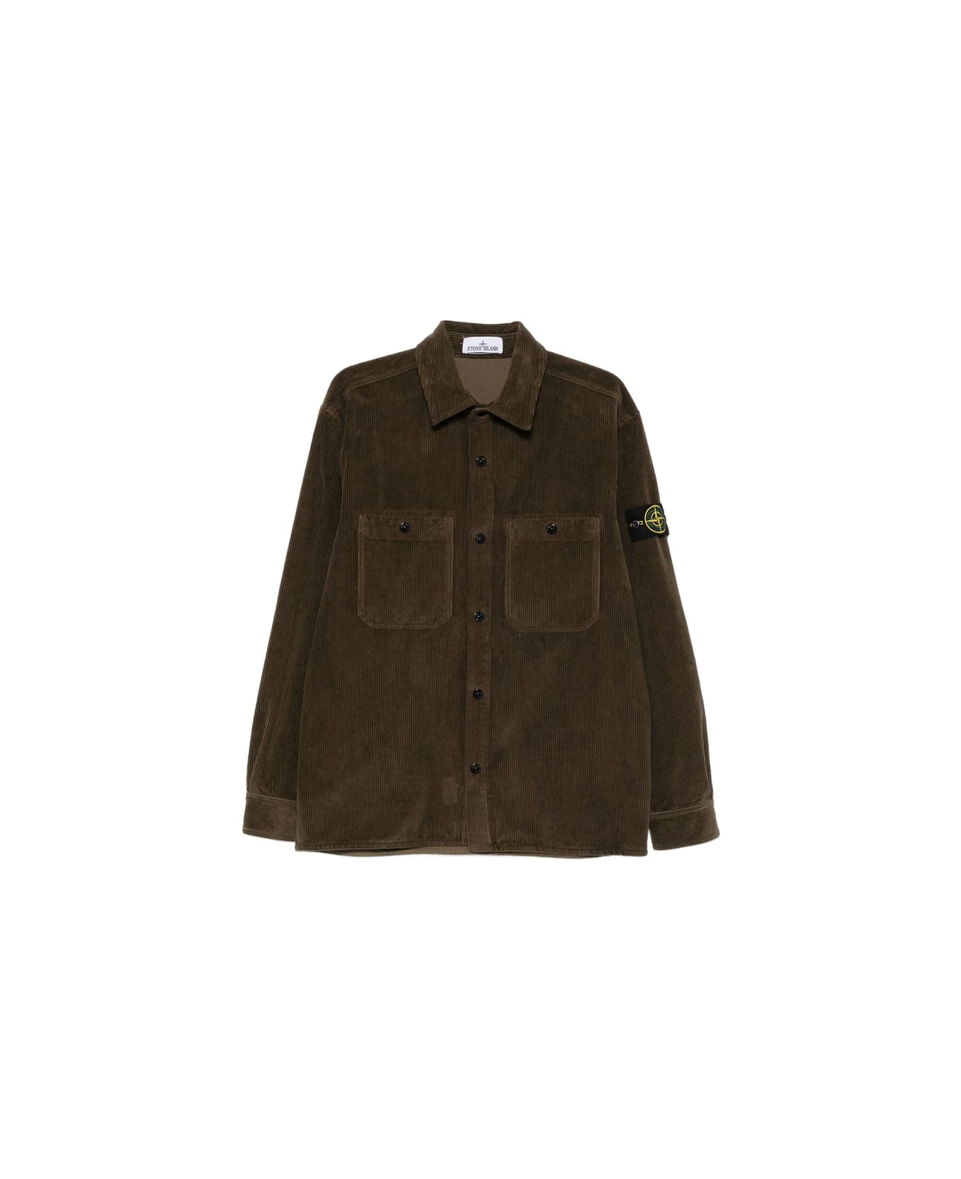 dark brown corduroy texture point collar button fastening chest patch pockets logo patch at the sleeve