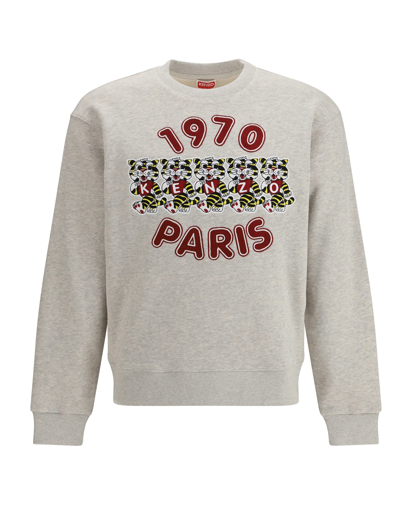 The wild tiger cotton sweatshirt by kenzo showcases a new interpretation of the maison s iconic tiger, intricately embroidered on the front. crafted from lightweight, unbrushed cotton fleece, it is soft and ideal for mid-season wear. the design offers a comfortable fit and is completed with clean finishes that highlight the bold, graphic embroidery.
