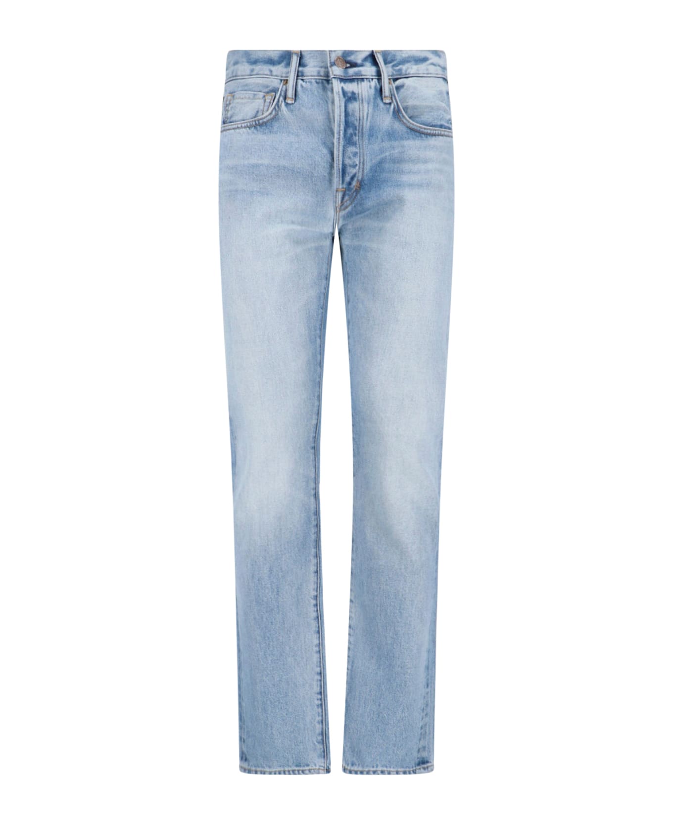 Tom Ford slim jeans in light blue cotton denim blend with used-effect wash, mid waist, belt loops, five-pocket design, button and zip closure, black logo patch on the side, leather logo patch on the back, and slim leg.