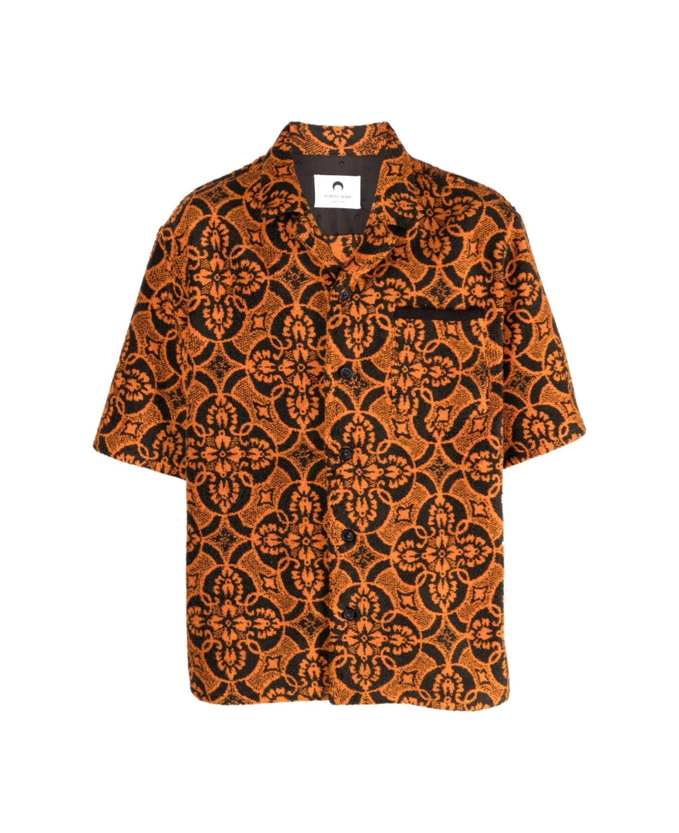 Oriental Towel-print. short-sleeve shirt from MARINE SERRE featuring orange, black, cotton, terry-cloth effect, geometric print, logo patch to the rear, camp collar, front button fastening, short sleeves, straight hem and chest patch pocket.