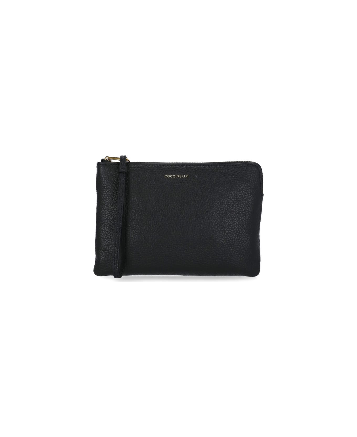 - Black Coccinelle pebbled leather pochette for woman - Front contrasting colour embossed logo - One main compartment - One internal pocket - Zip fastening