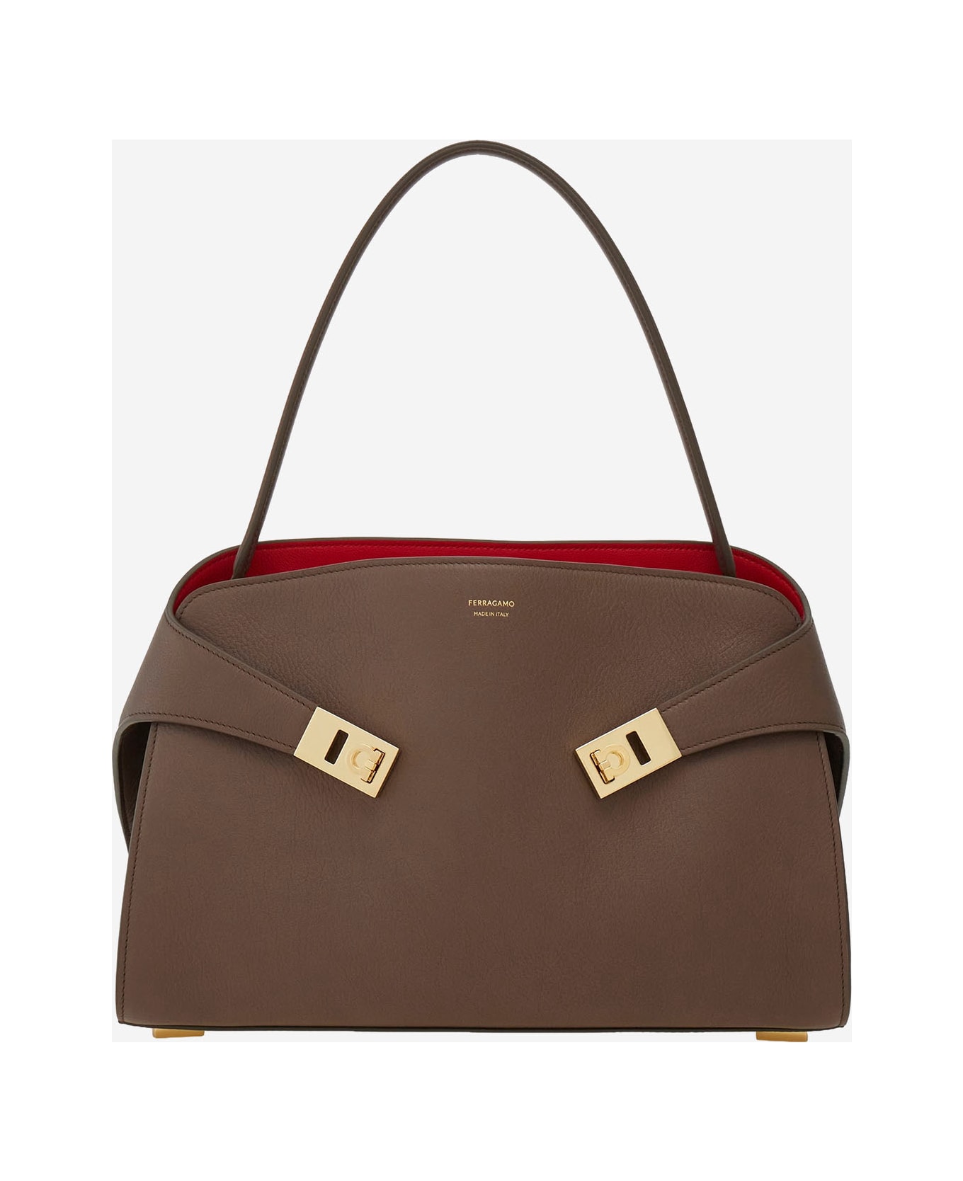 Leather bag One top handle Logo detail on the front Decorated with gold-tone buckles and hooks Internal flap closure One main compartment and two side compartments One adjustable and removable shoulder strap Brown Made in Italy Composition: 100% leather