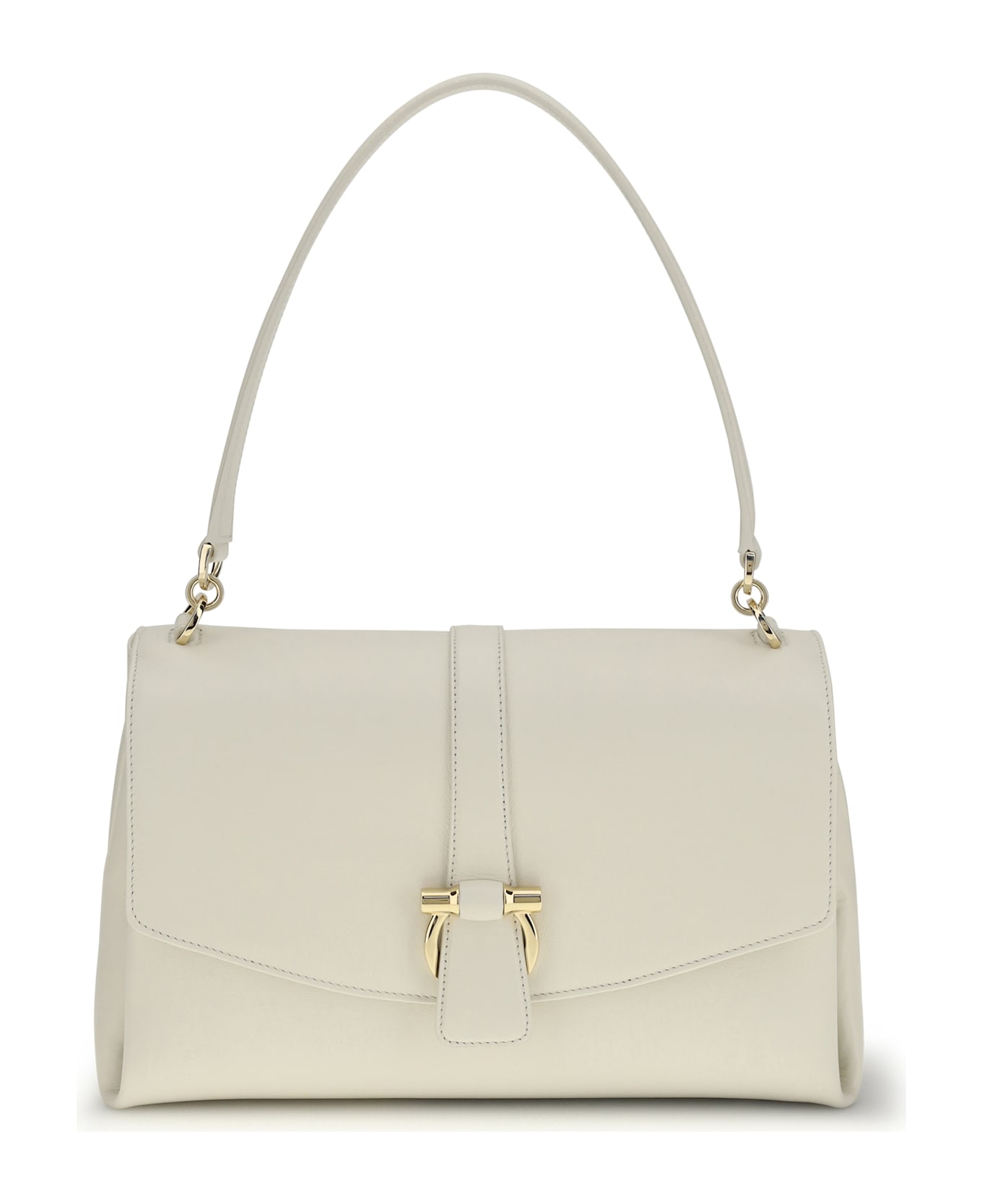 The leather shoulder bag by ferragamo combining classic inspiration and contemporary style. the semi-rigid structure is softened by voluminous waves reminiscent of the shape of the florentine lily. a wide leather shoulder strap slips into a gold hook on the front flap, an iconic touch that matches the gold finishes of the medium-length shoulder bag. Composition: 100% % Calf Leather Bos Taurus