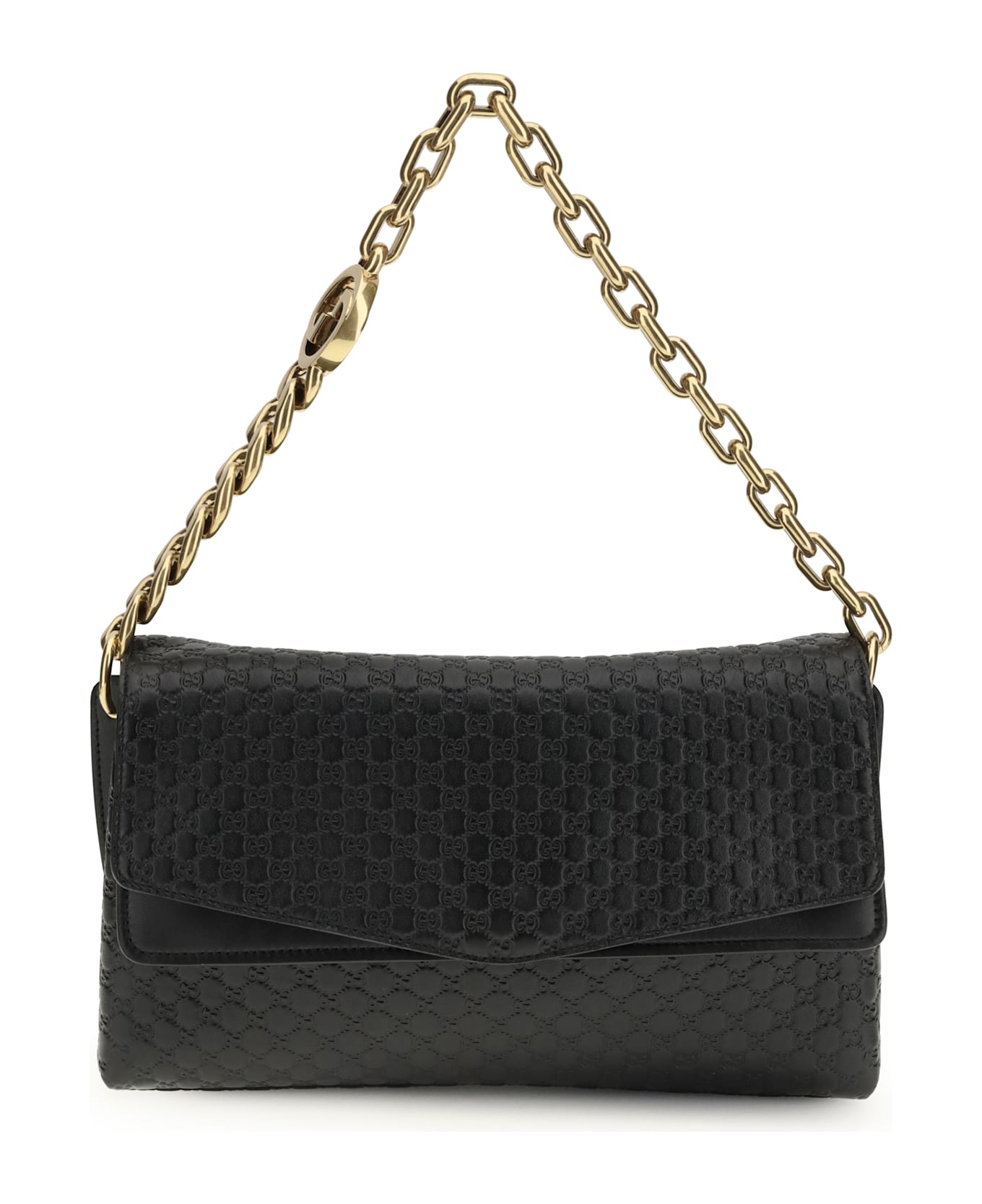 The medium chain shoulder bag by gucci is a refined model that combines the house s emblematic motifs with a contemporary silhouette. crafted from embossed gg grained leather, it features antiqued gold-toned hardware and a double-gusset interior designed for optimal organisation and generous capacity. the cotton and linen lined interior includes an open pocket, while the automatic magnetic closure ensures practicality and security. the design is elevated by the signature round gg interlocking detail on the chain, adding a distinctive and sophisticated touch.