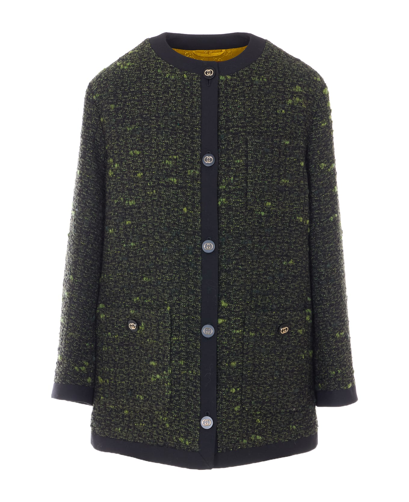 Gucci green tweed jacket, GG logo buttons closure, crewneck, long sleeves, pocket on the front Composition: 86% Wool, 10% Polyamide, 4% Polyester, 100% Wool