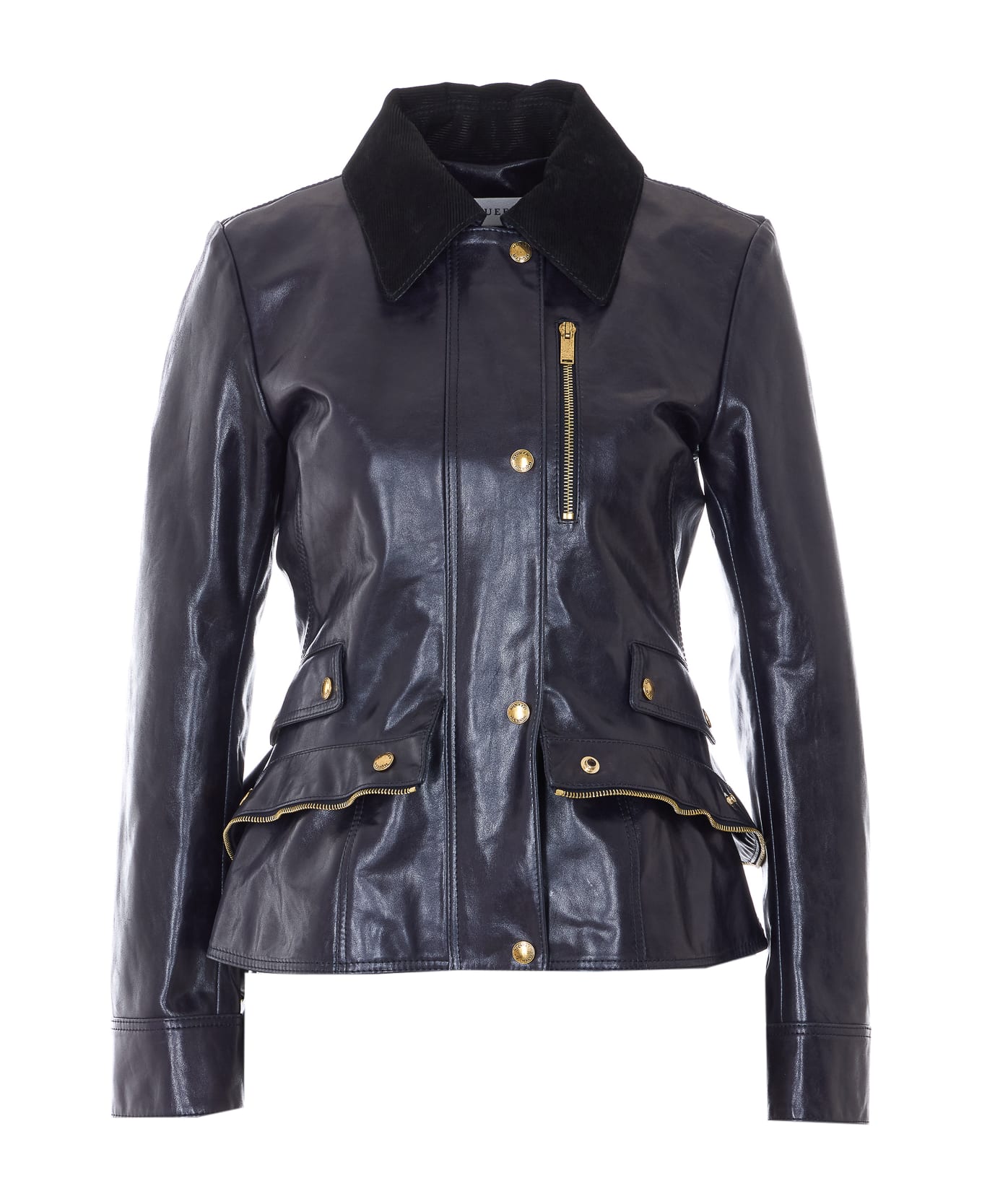 Mcqueen blue leather jacket with frontal zip and buttons closure, regular collar, long sleeves, button on cuffs, asymmetrical model at bottom Composition: 100% Genuine Leather, 100% Calfskin, 100% Calfskin, 62% Cotton, 38% Cupro, 100% Cupro
