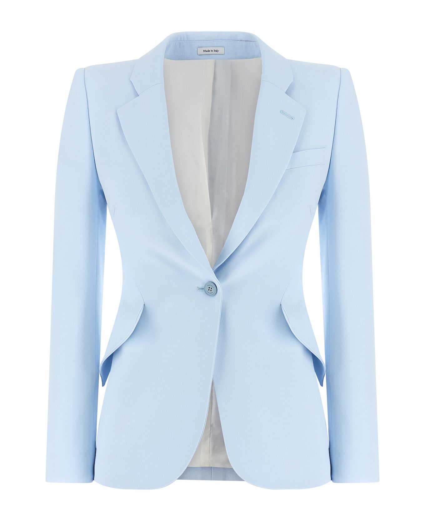 Single-breasted thin crêpe blazer with front button closure, hourglass silhouette, mirror lapels, breast pocket, flap pockets, structured and padded shoulder strap, long sleeves, chain with metal T-detail and back split, lining.