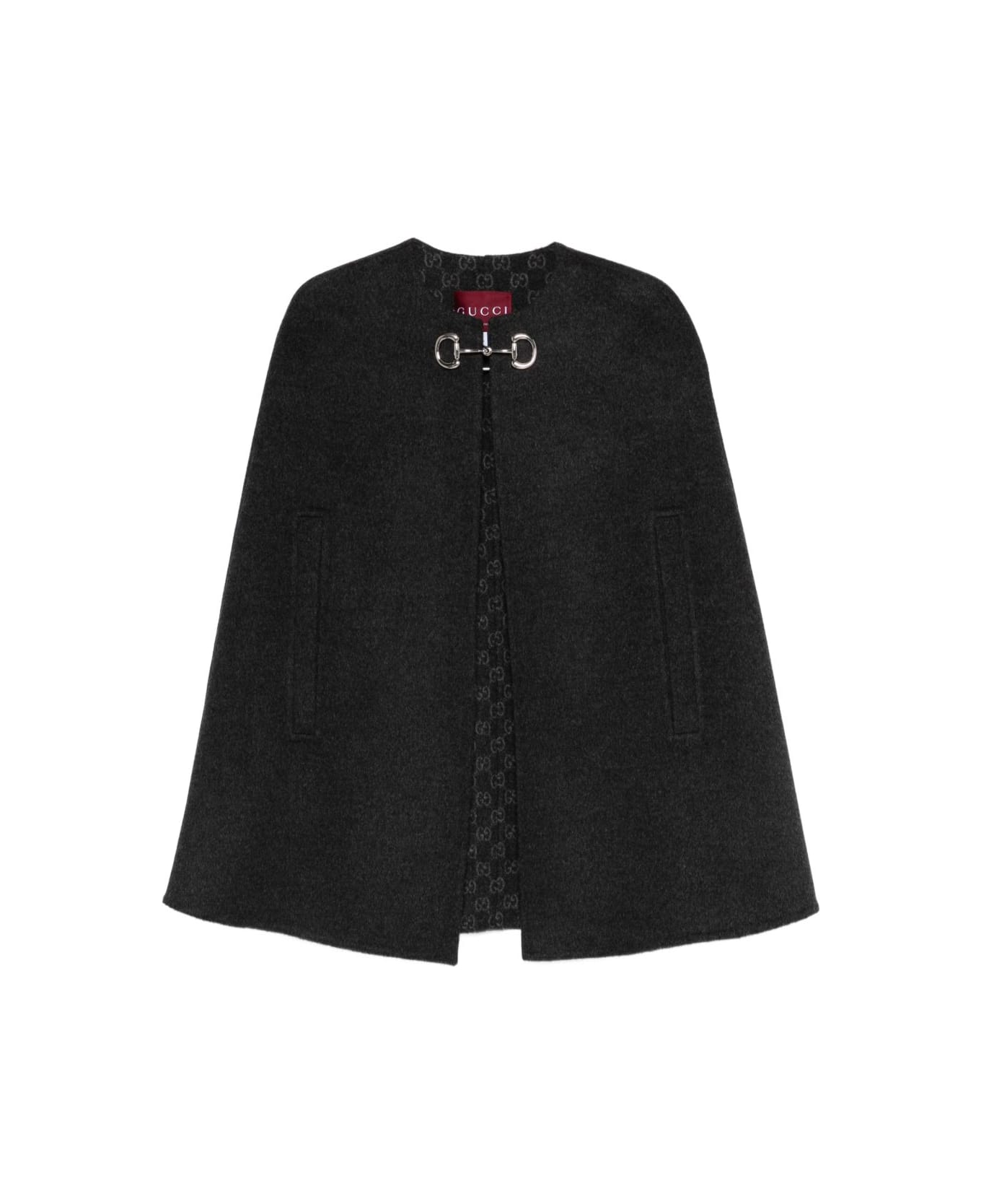 dark grey jacquard logo pattern horsebit detail sleeveless side slits concealed snap fastening Composition: 100% Wool Mix
