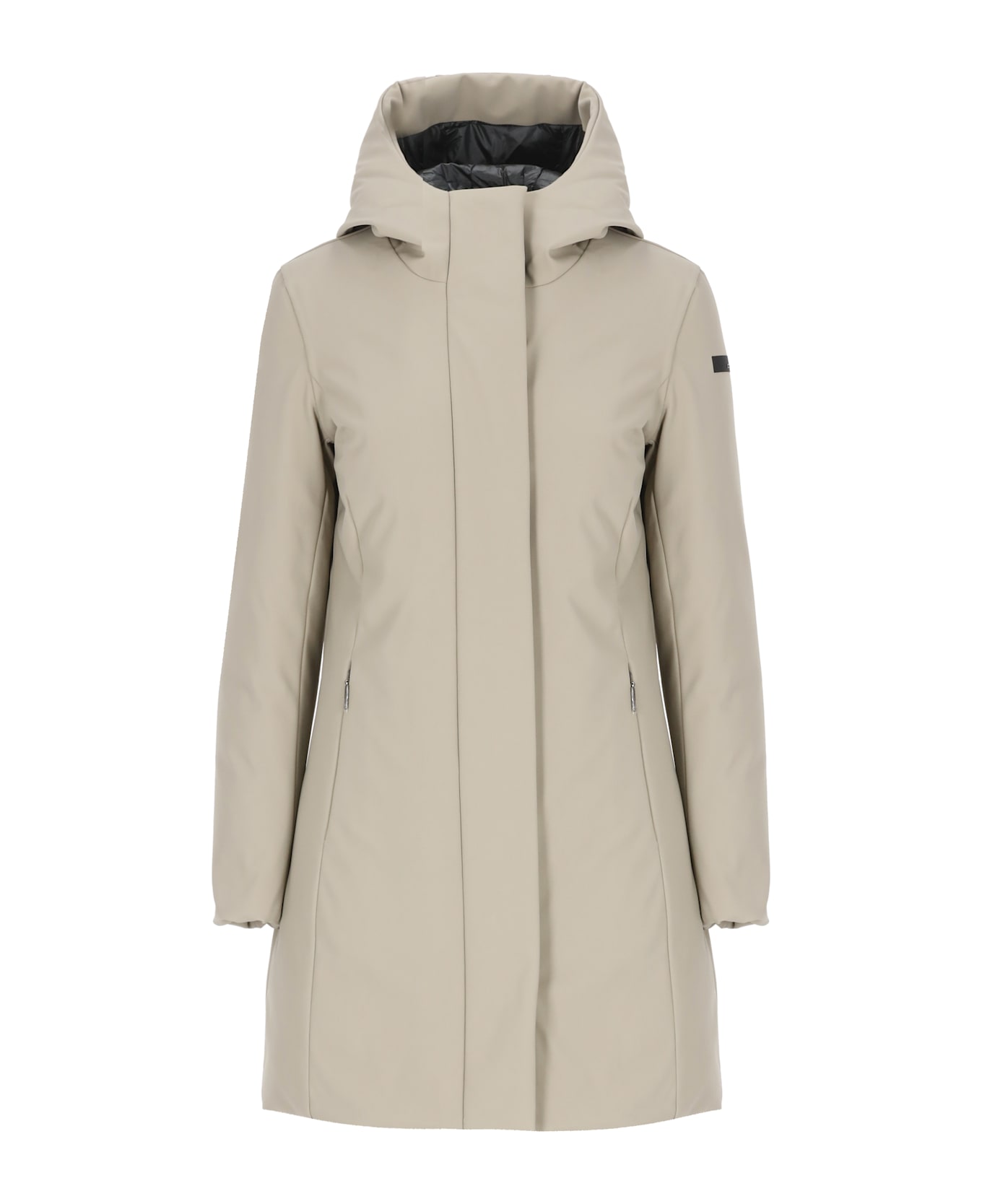 - RRD Roberto Ricci Design woman's beige padded coat - Hood - Long sleeves with logoed patch at left sleeve - Front zip fastening - Two side zip pockets Composition: 80% Polyamide, 20% Elastane Lining:, 100% Polyamide Filling:, 90% Duck Down, 10% Duck Feathers