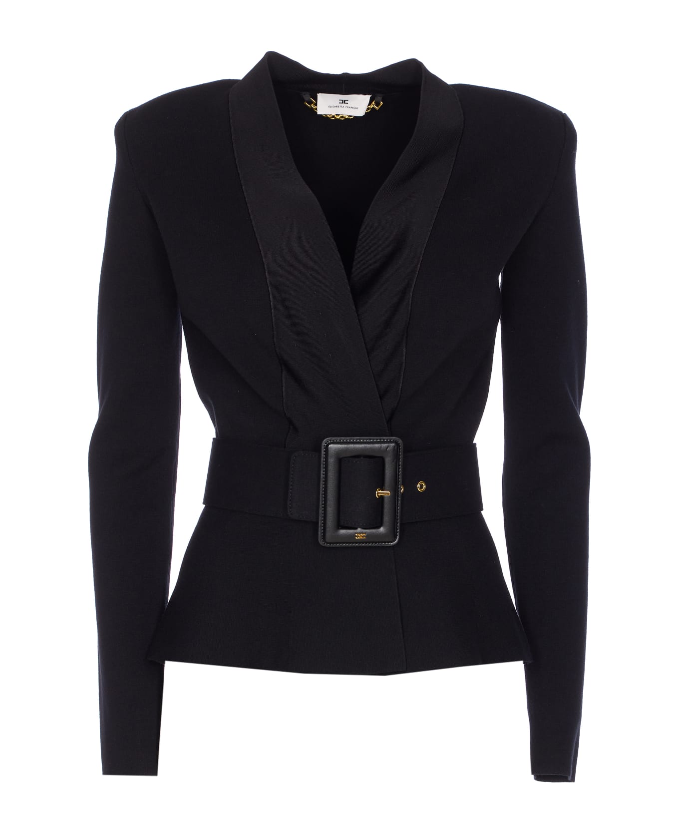 Elisabetta Franchi black jacket with frontal double breasted buttons, long sleeves, v-neck, reinforced shoulder, belt on waist, elasticized fit Composition: 60% Viscose, 23% Polyester, 17% Polyamide