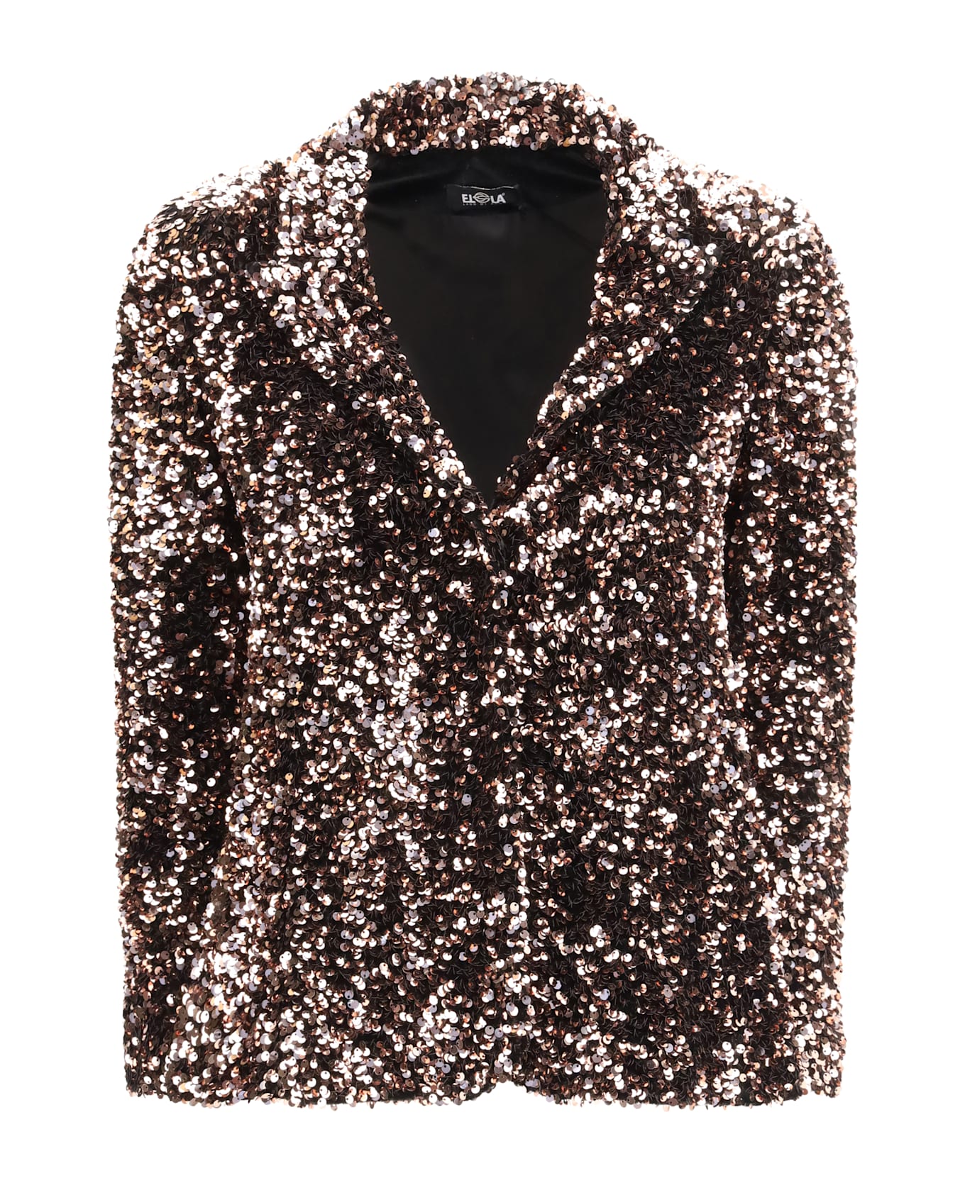The single-breasted jacket fully embellished with sequins by ella, featuring a front press-stud closure that ensures a clean and effortless fastening. the design includes classic lapels, an elegant, feminine silhouette, and side vents for added comfort and ease of movement. a striking piece ideal for evening outfits or special occasions, where the shimmering sequin surface becomes the true centerpiece.