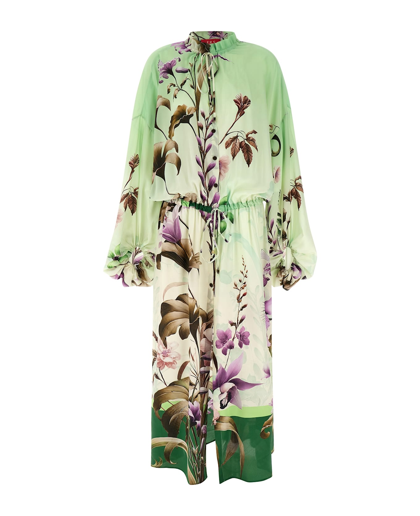 all-over 'Cenide' crepe de chine silk maxi dress with all-over 'Wildeflowers' print, ruffle neck, adjustable V-neck with drawstring, front button closure, long balloon sleeves with elastic cuffs, drawstring at the waist.