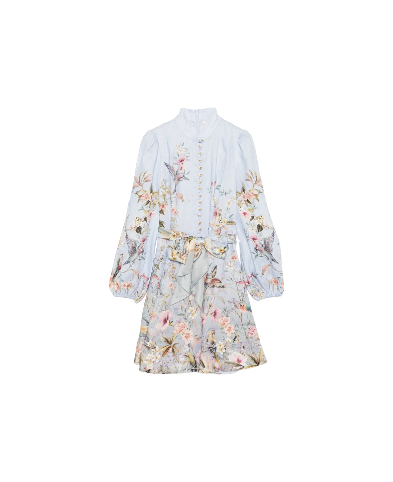 light blue floral print rouleau buttons on the front raised collar removable scarf belt flared skirt