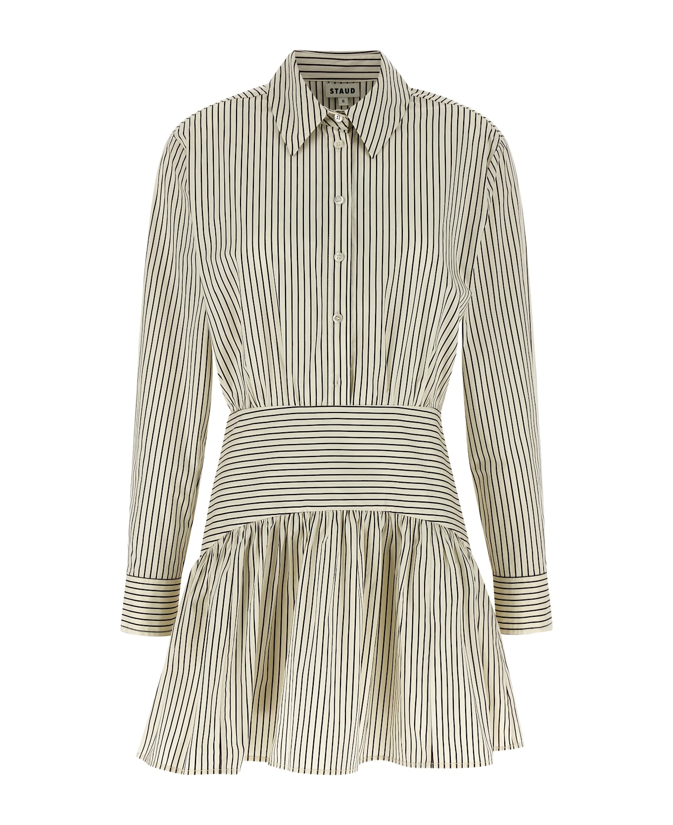 'Rocco' mini dress in striped cotton poplin with chemisier style, shirt collar, front button closure, curled waist, long cuffed sleeves.