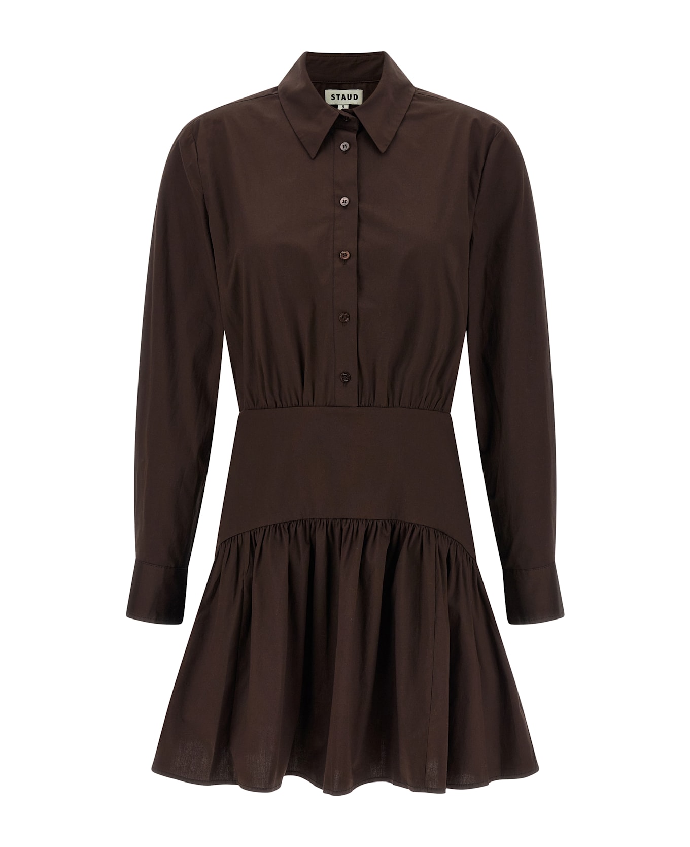 'Rocco' chemisier mini dress in cotton poplin with shirt collar, front button closure, gathered waist, long cuffed sleeves.