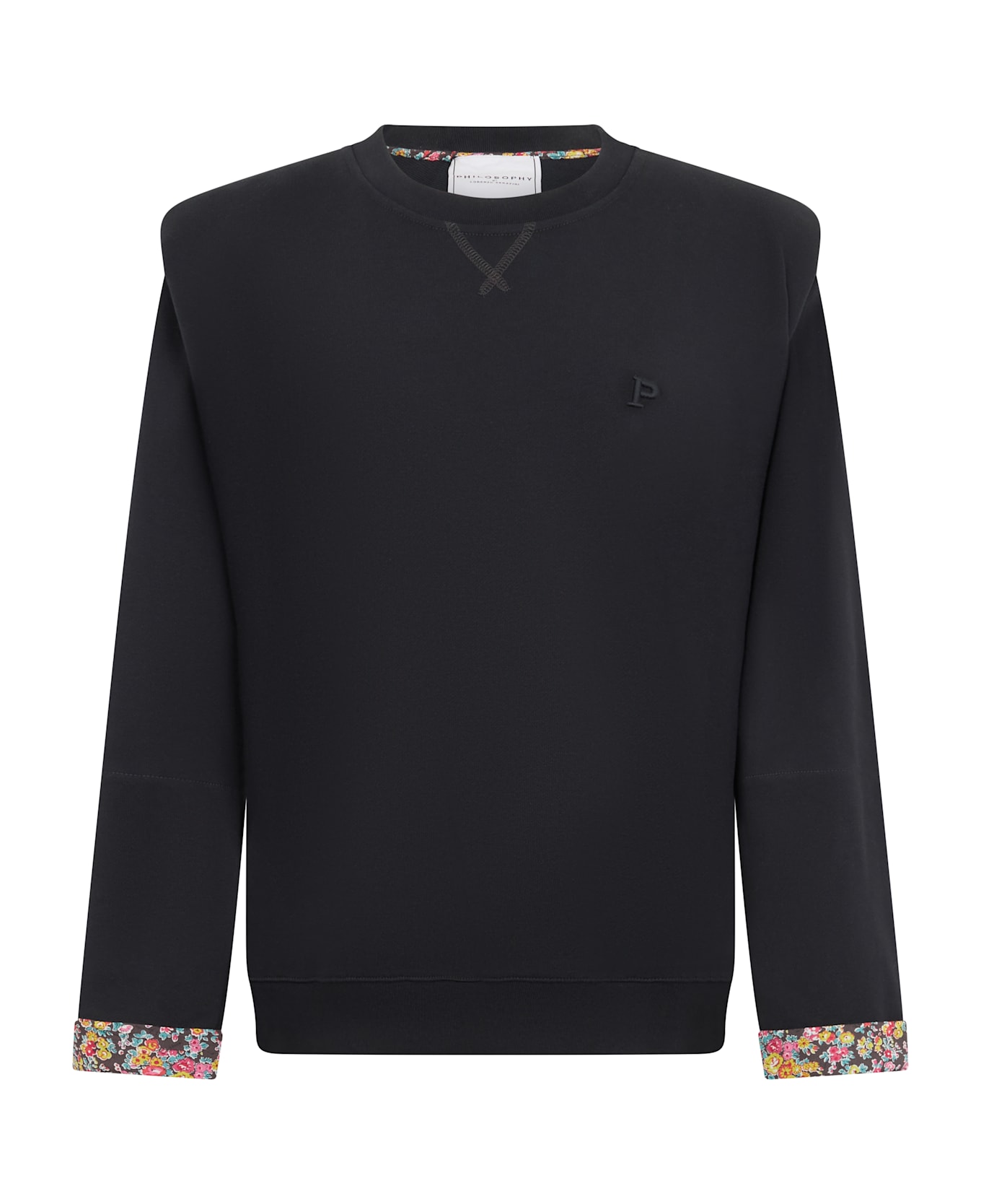 Black sweatshirt characterized by a simple and versatile design, perfect for any occasion. it features long sleeves and a classic cut that ensures comfort and freedom of movement. the cuffs are finished with a contrasting floral detail, and the straps are padded, adding a touch of style to the garment. made from a soft fabric, it is ideal for layering or wearing alone during cooler days. available in different sizes to meet any need.