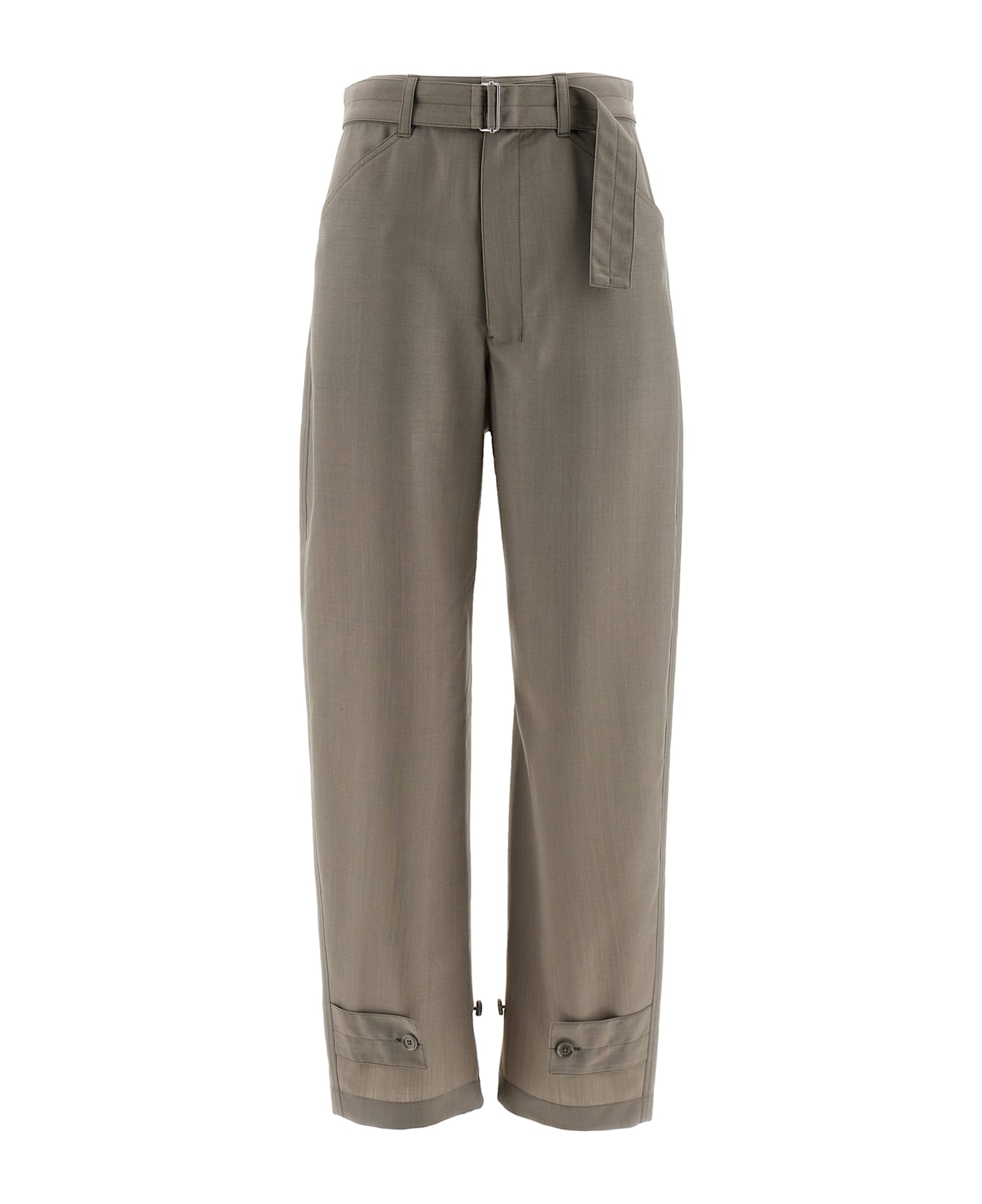 Curved Tailored' straight pants in wool, belt loops at the waist with adjustable belt with buckle, zip, hook and button closure, pockets, adjustable tape with button on the cuffs.