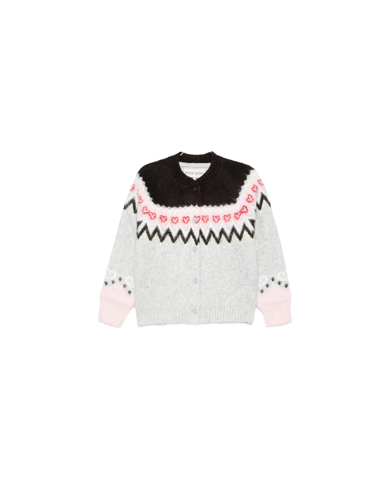 light grey fair-isle pattern heart motif button fastening long sleeves ribbed cuffs