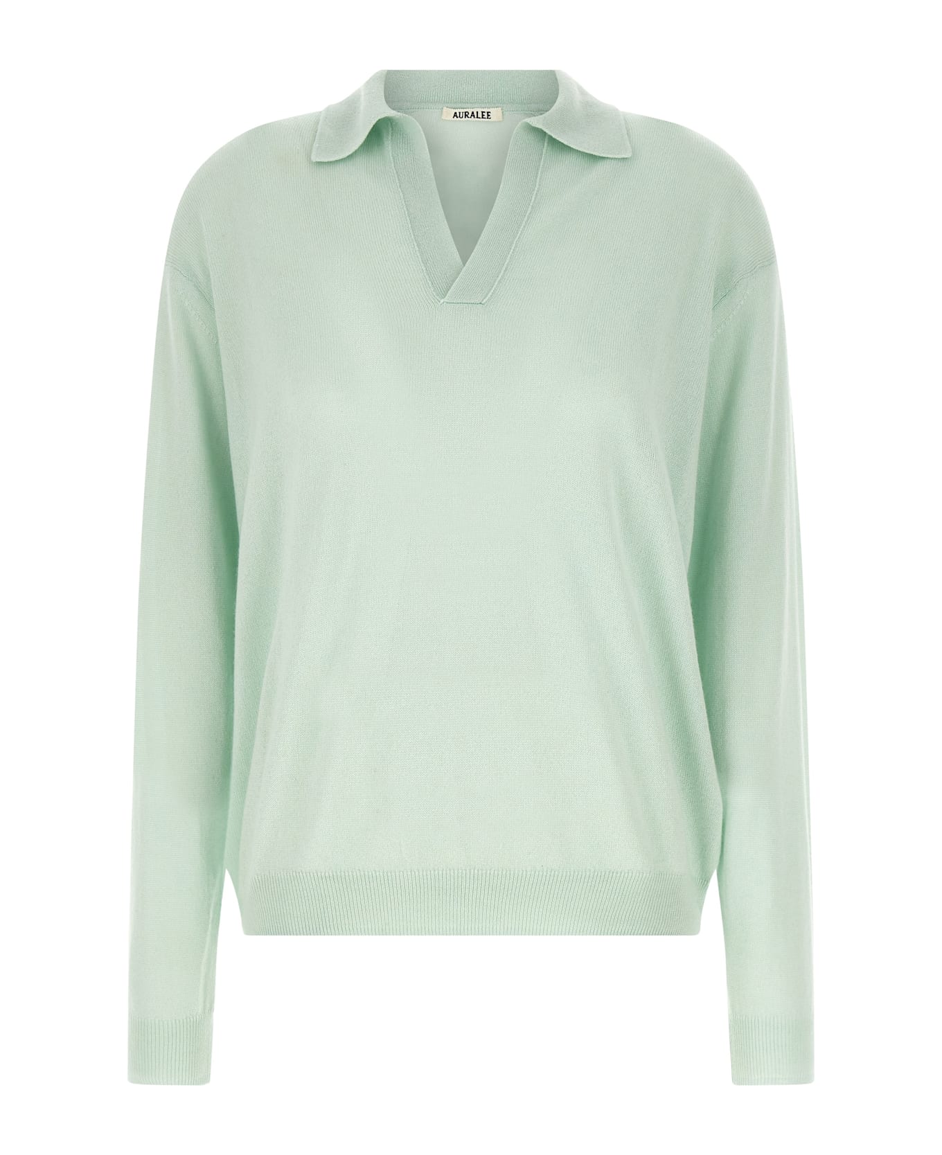 Cashmere and silk sweater with V-neck collar, long cuffed sleeves and dropped shoulders.