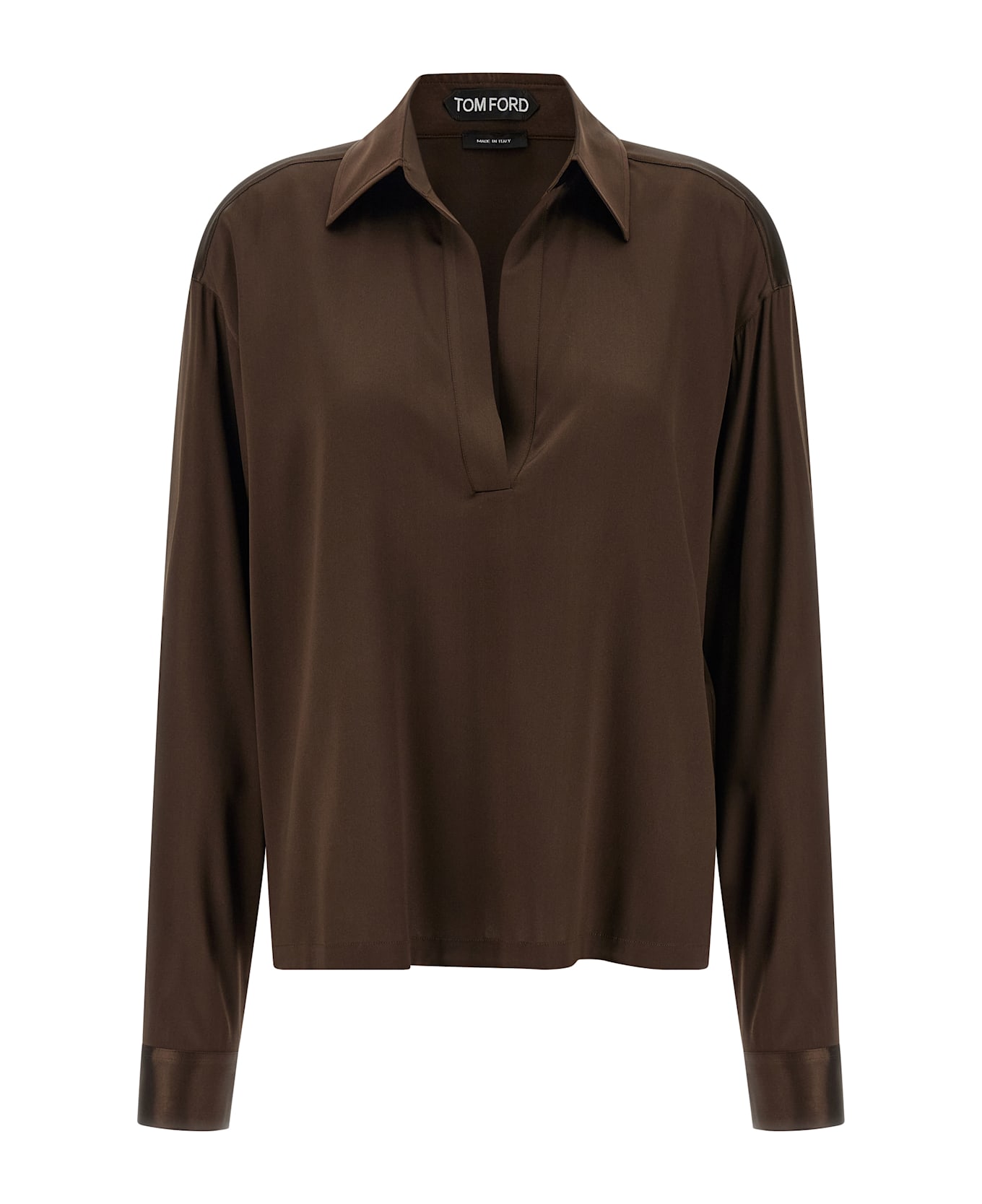 Polo shirt in stretch silk satin, collar and V-neck, long sleeves with cuffs and dropped shoulder, side slits. Composition: 94% silk 6% elastane