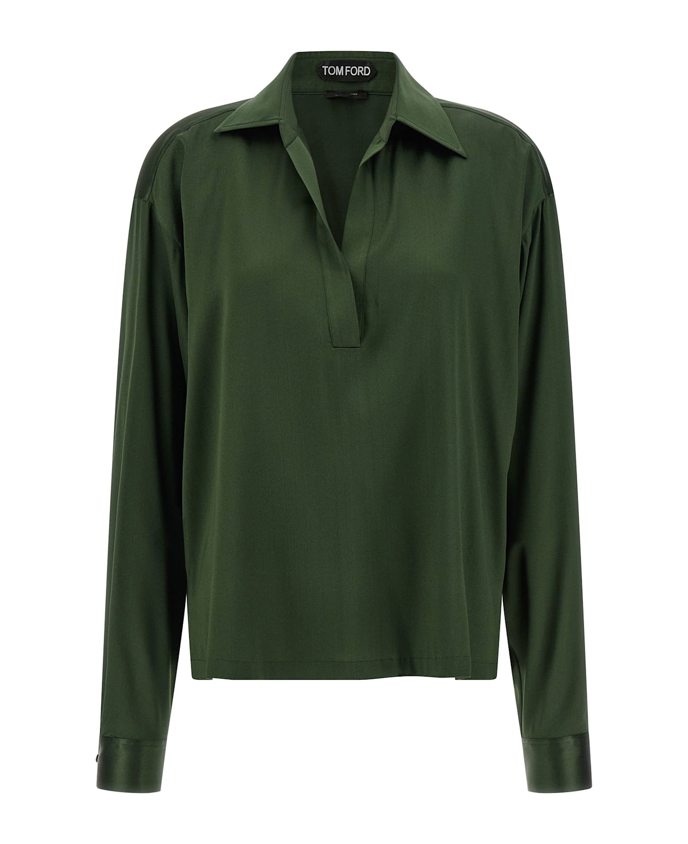 Polo shirt in stretch silk satin, collar and V-neck, long sleeves with cuffs and dropped shoulder, side slits.