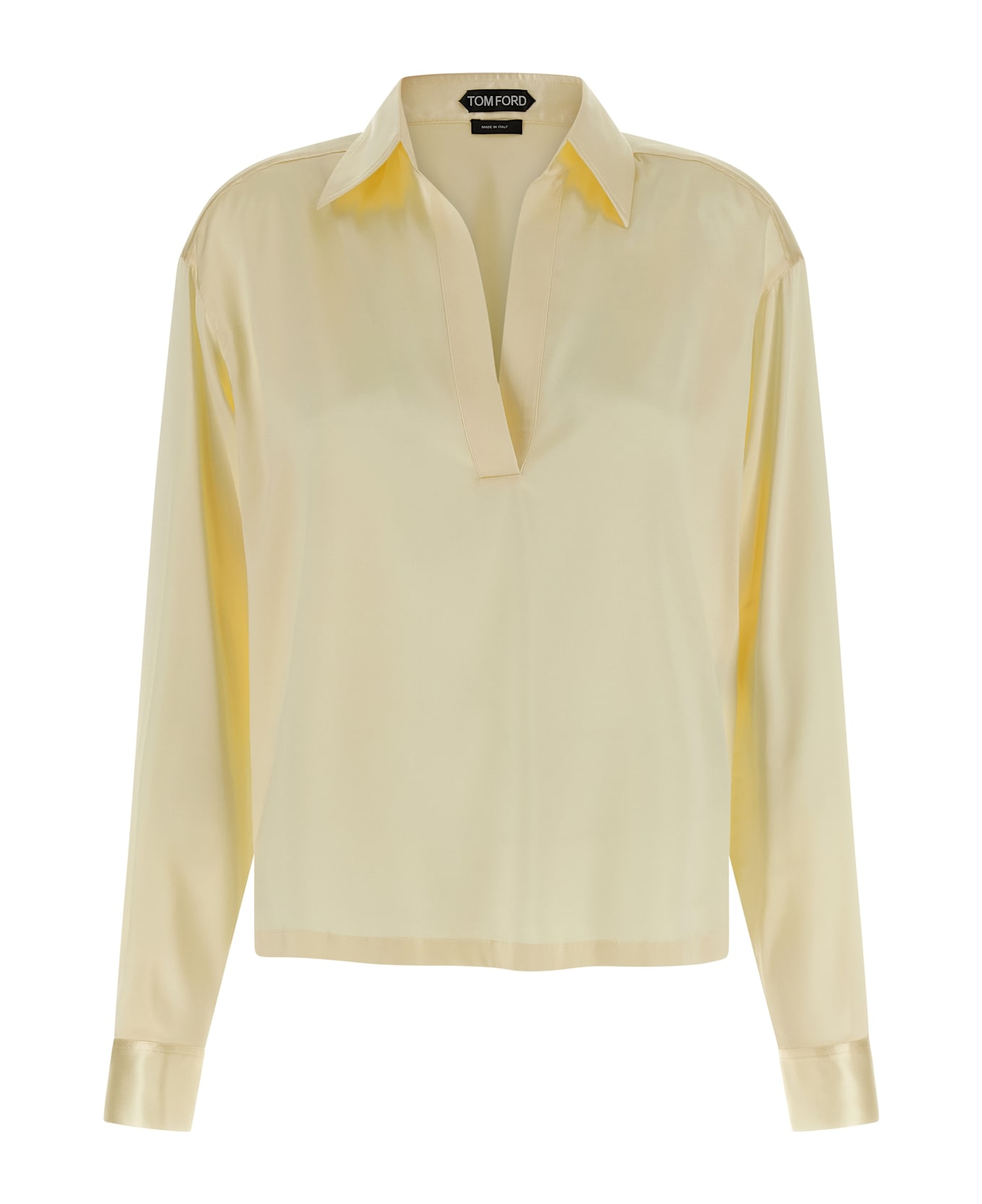 Polo shirt in stretch silk satin, collar and V-neck, long sleeves with cuffs and dropped shoulder, side slits. Composition: 94% silk 6% elastane