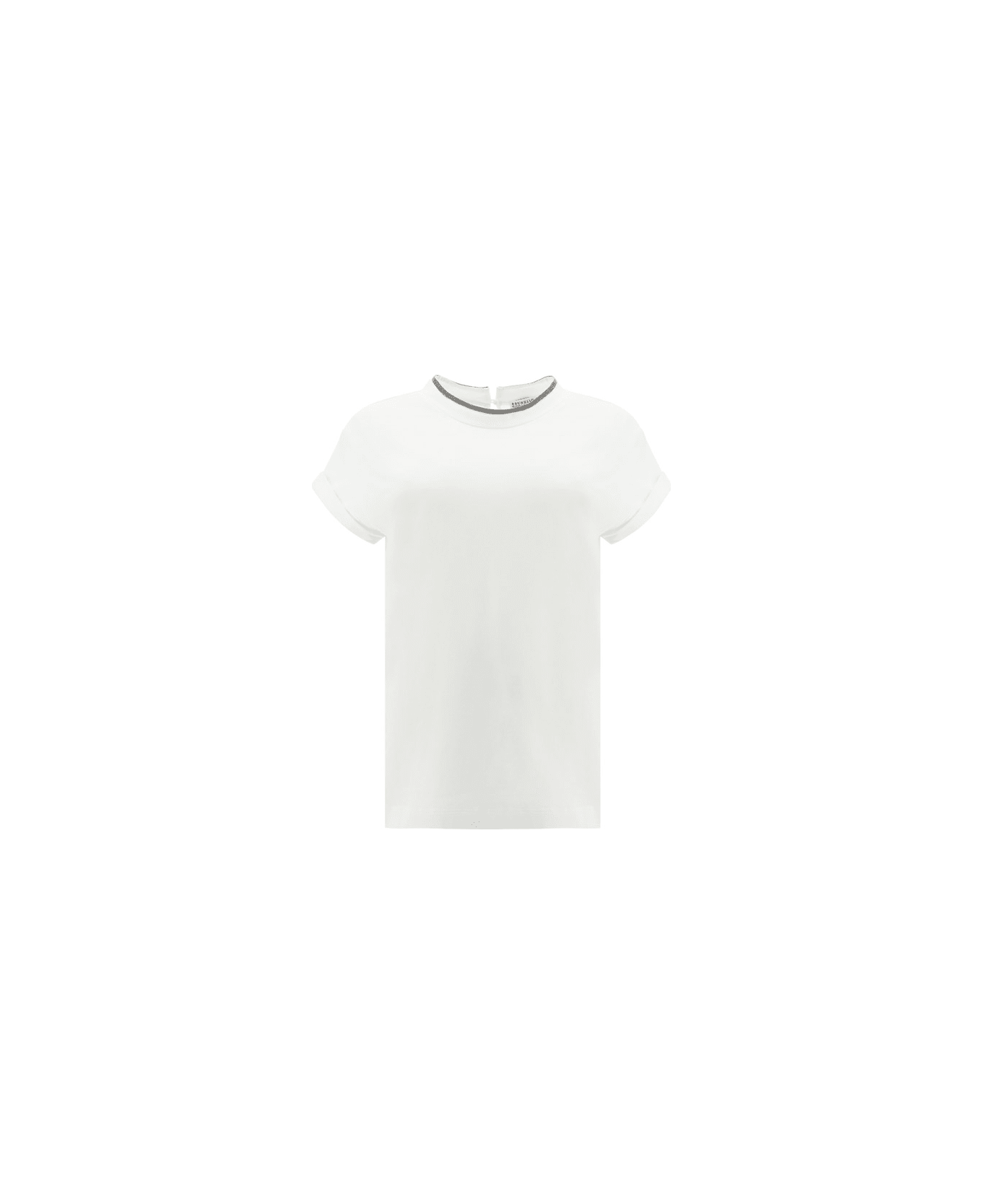 The cotton t-shirt by brunello cucinelli features a clean, understated silhouette elevated by the brand s iconic detailing. the neckline is embellished with contrasting monili, while a back keyhole with button closure adds a refined touch. finished with a regular fit, it balances comfort and sophisticated simplicity.