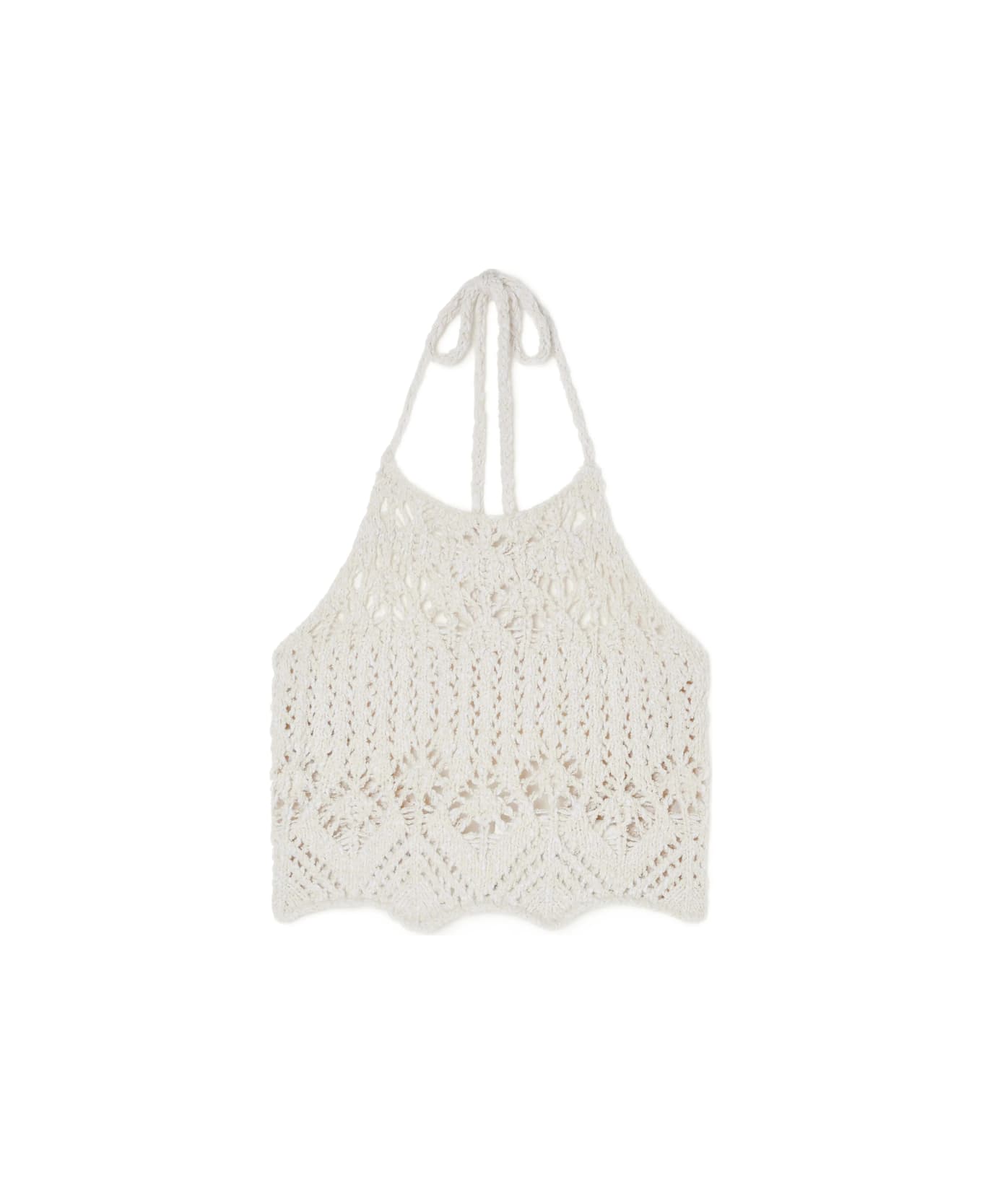 white crochet knit halterneck tie fastening scalloped trim