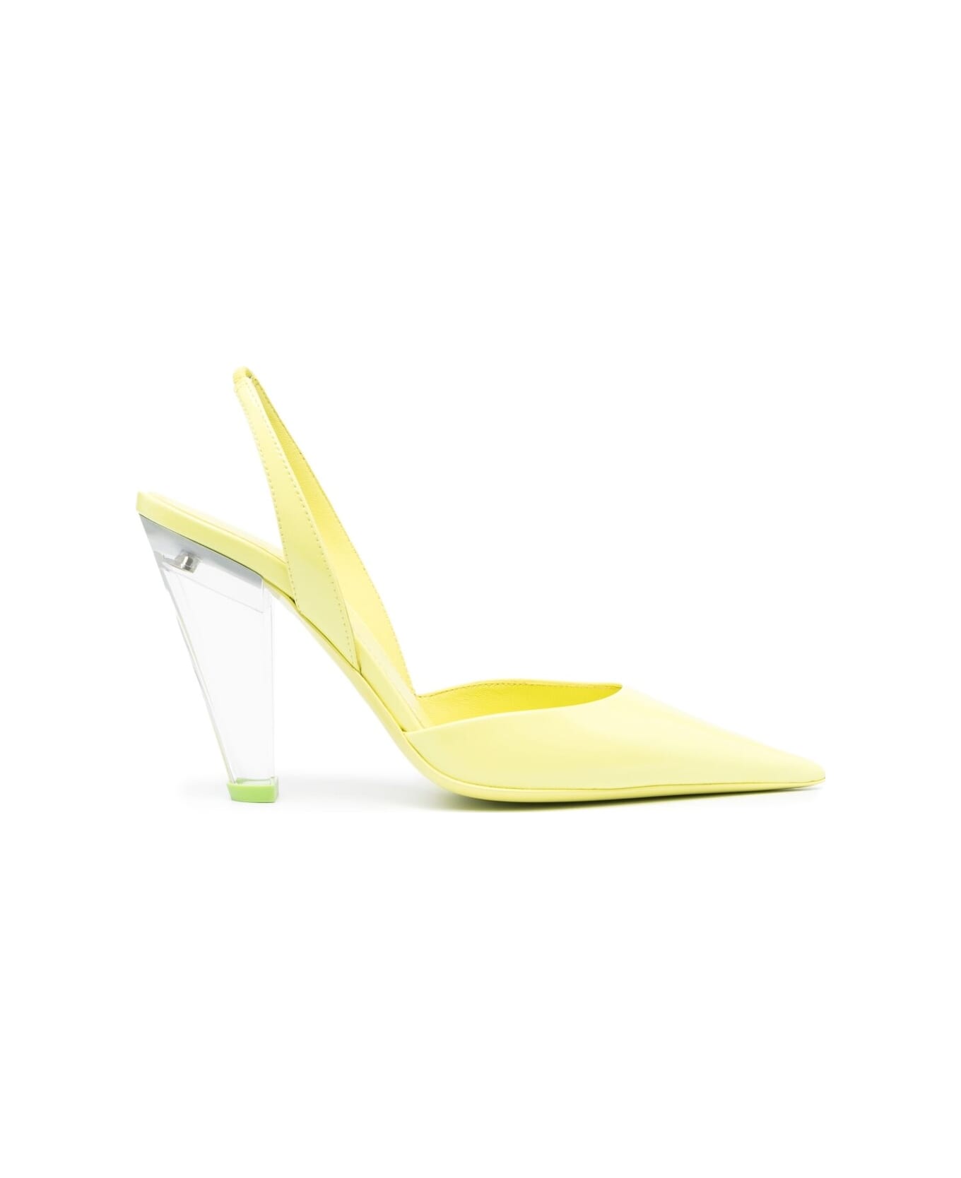 105mm leather pumps from 3juin featuring yellow, calf leather, pointed toe, branded insole and transparent tapered heel.