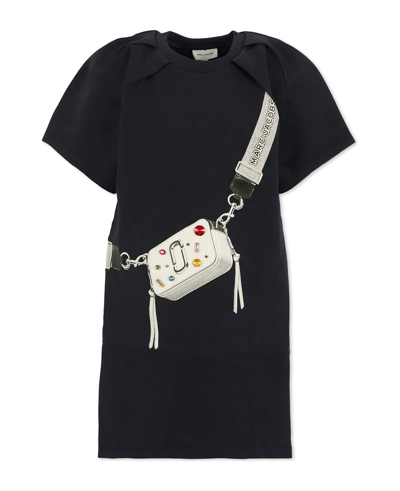 Blue dress with short sleeves and a crew neck. It is embellished with "Snapshot" bag print and stones on the front.
