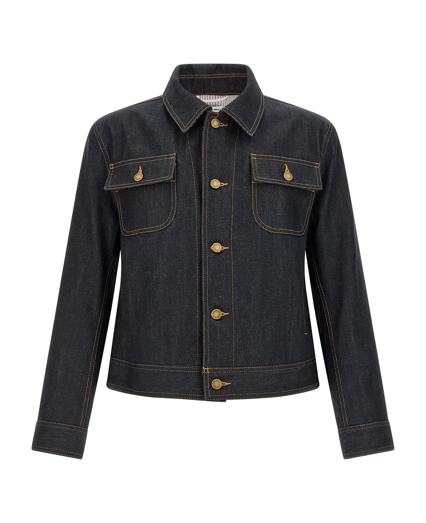 Japanese selvedge cotton denim jacket with contrast stitching, flared silhouette, shirt collar, front button closure, pockets, long cuffed sleeves.