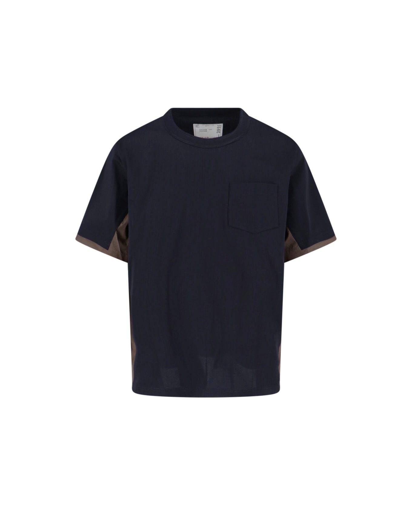 Sacai dark blue cotton T-shirt with contrasting trim, ribbed crew neck, dropped shoulders, flat front pocket, side zip pocket, straight hem. Composition: 100% Cotton