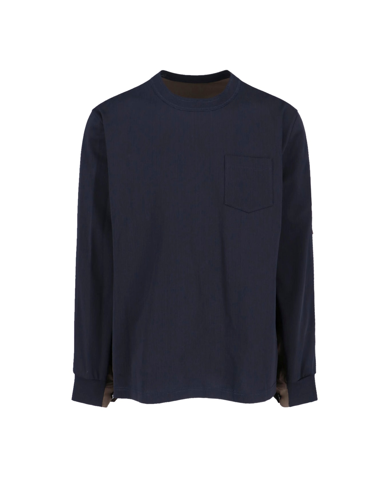 Sacai two-color sweater, in blue cotton on one side, green on the other, crew neck, dropped shoulders, flat front pocket, two side pockets, button cuffs, straight hem. Composition: 100% Cotton