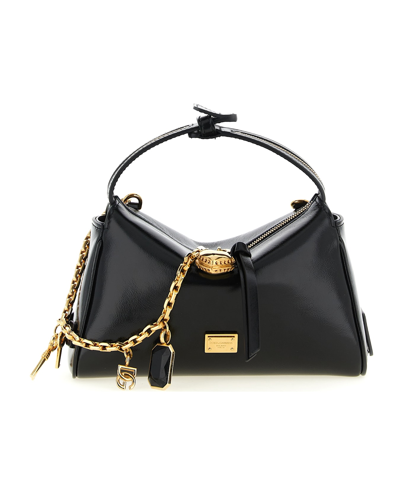 'Vittoria' mini calf leather handbag, monogalvanic tag with front engraved logo, top zip closure with chain zip puller and removable metal charms, opening handle, back embossed logo, adjustable and removable shoulder strap. Composition: 100% calfskin leather (Bos Taurus)