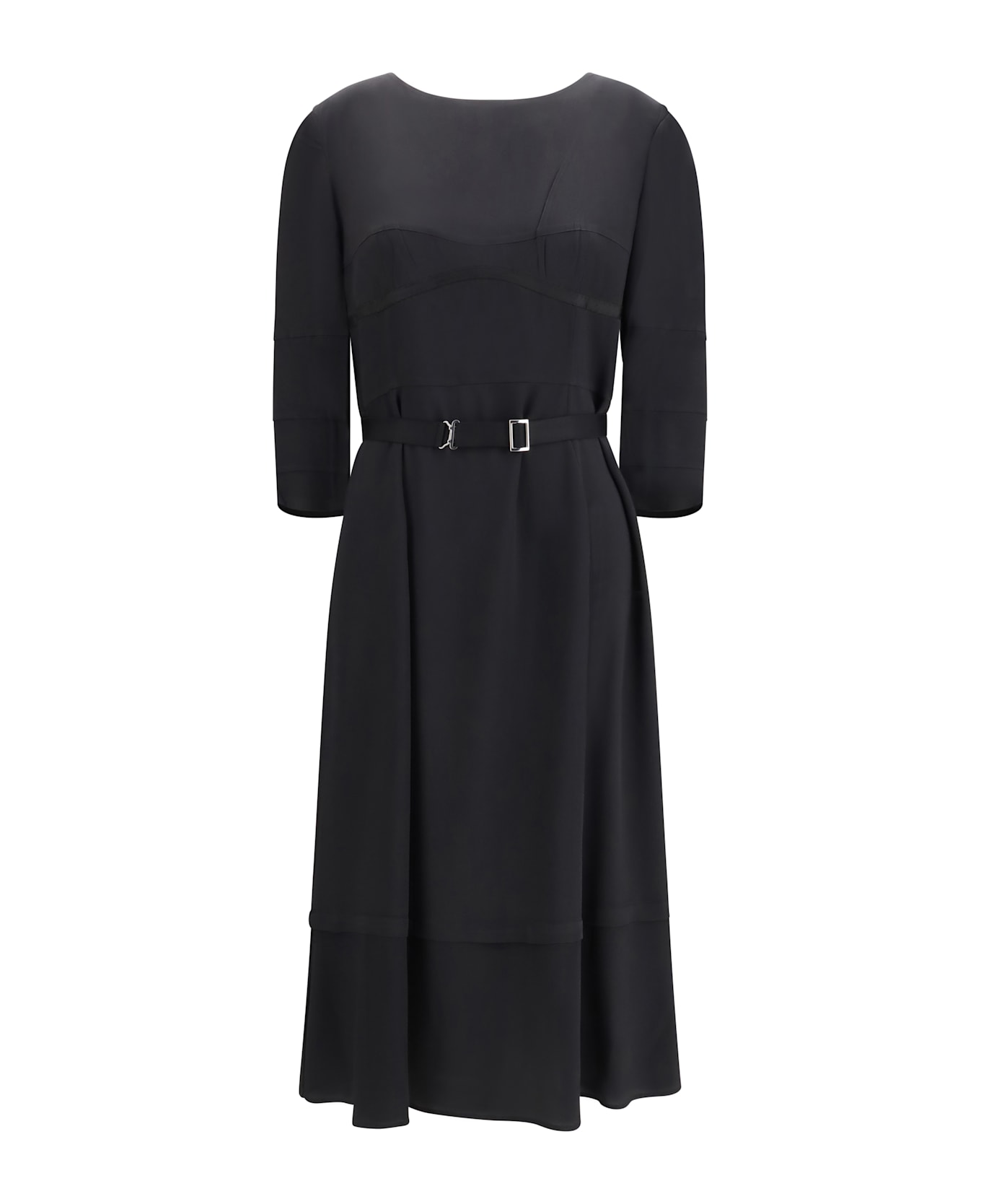 The wool and silk midi dress by prada is a sophisticated and modern garment, made from a fine combination of wool and silk that offers comfort and refinement. the round neckline and long sleeves give it an elegant look, while the technical nylon belt at the waist adds a touch of modernity and structure. the button closure at the back completes the design with a chic and functional detail. perfect for a versatile look that combines elegance and comfort. Composition: 43% % Wool, 35% % Mohair, 22% % Silk