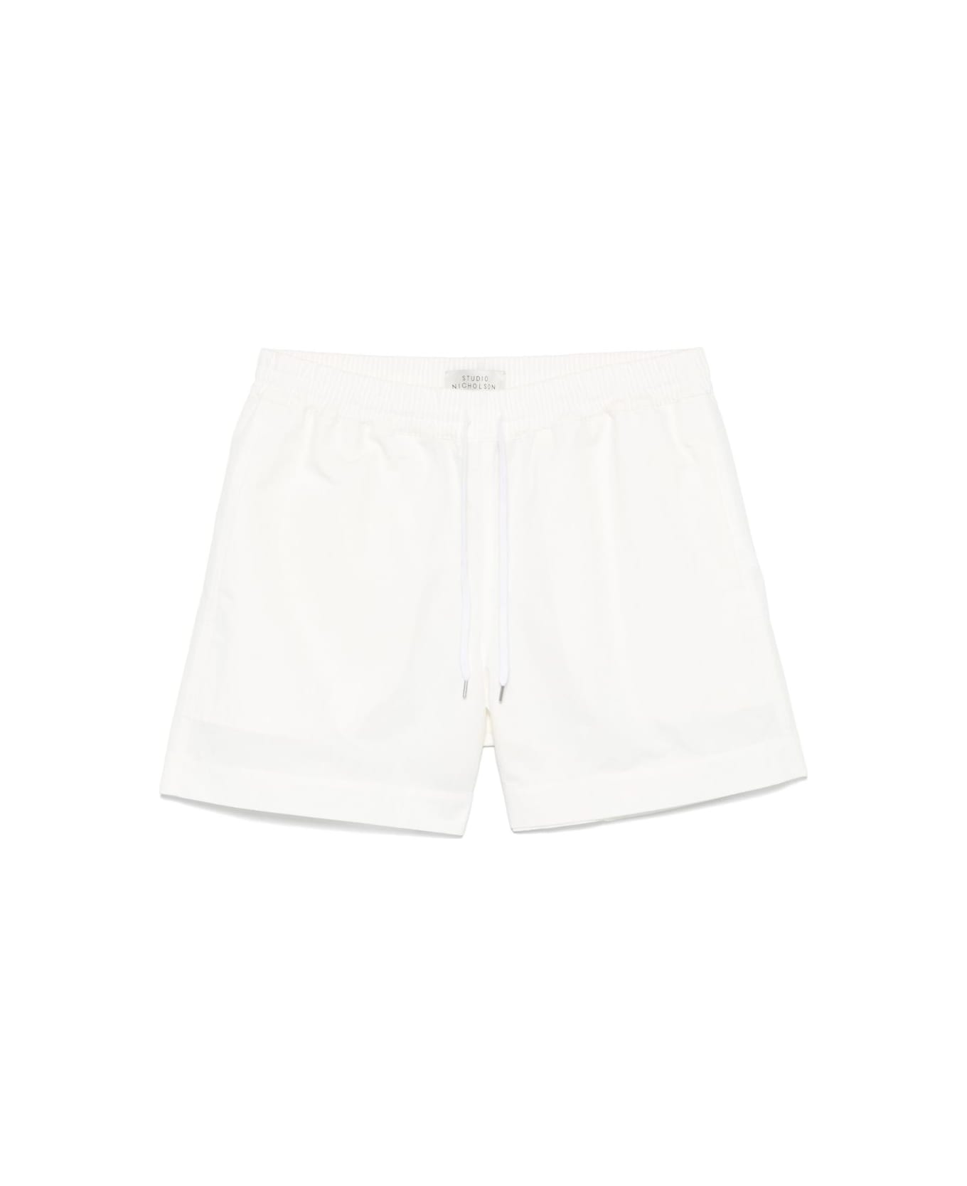 white elasticated drawstring waistband two side inset pockets rear patch pocket