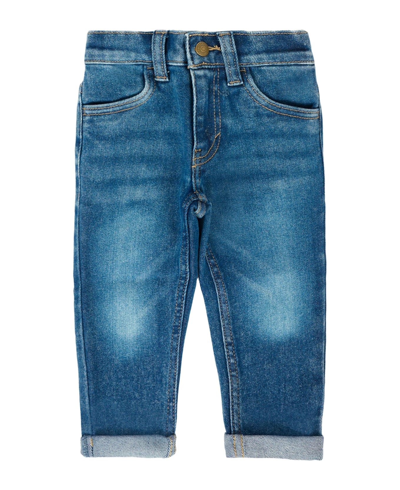 Five-pocket denim jeans, with front zip and hook fastening, elastic on the back and cuffed ankles. They are embellished with a logo patch on the back.