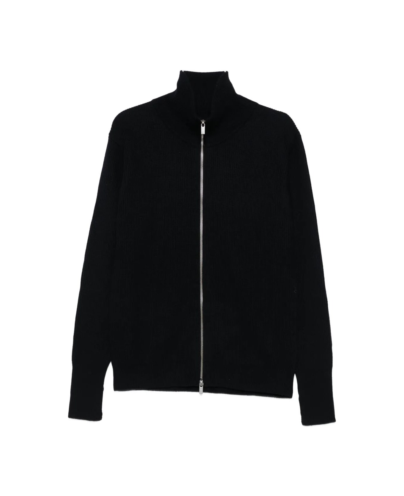 "Barena Venezia dark blue wool cardigan with a double-slider zipper and ribbed texture. "