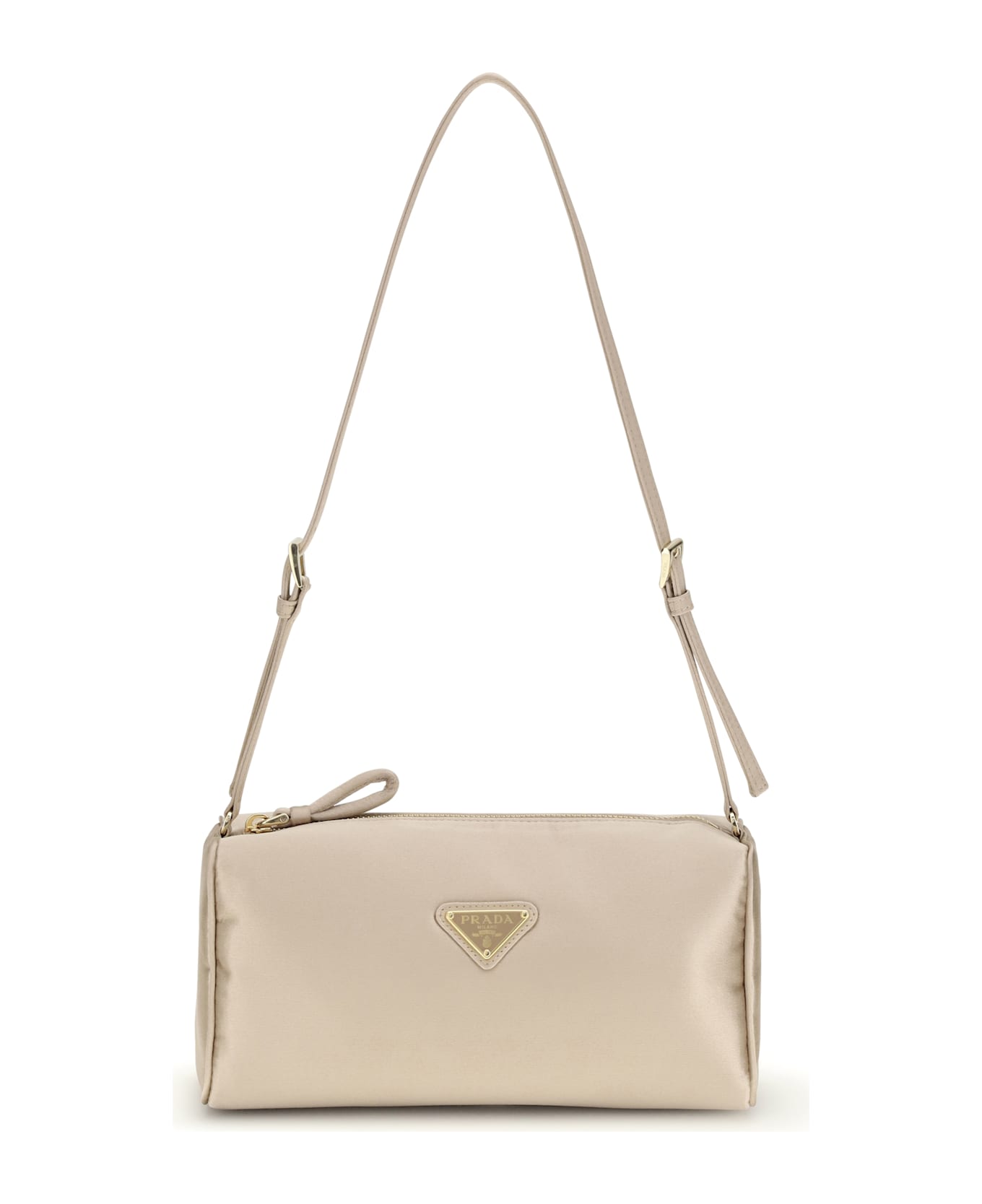 The satin shoulder bag by prada is an elegant and sophisticated accessory, characterized by a silhouette with essential geometries. featuring a top zip closure, it has an enameled metal triangle logo on the front, an adjustable shoulder strap with strap, and gold-tone metal hardware. the design is completed by a practical internal zip pocket, ideal for combining style and functionality in a single iconic piece.