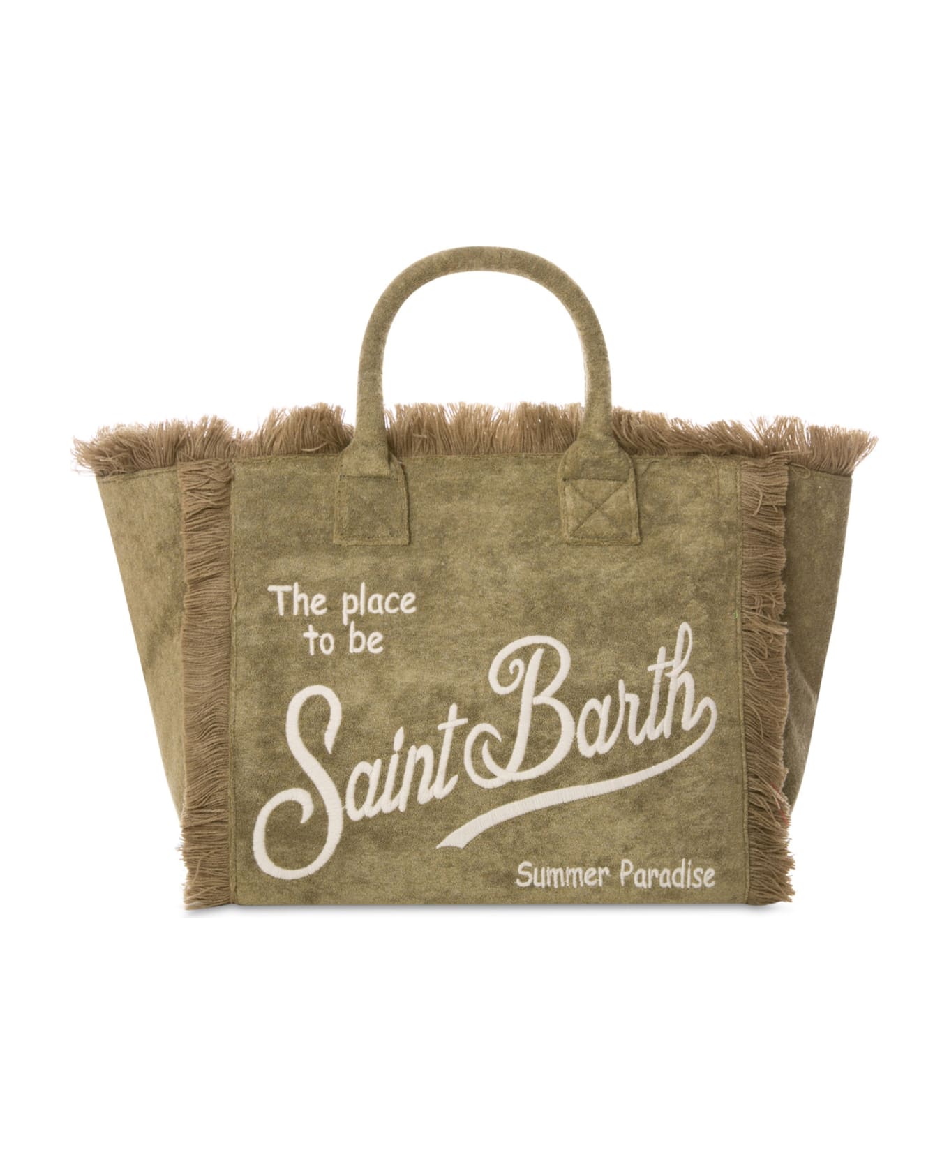 Vanity shoulder bag with fringes Military green solid color Saint Barth embroidered logo Inside pocket with zip Sizes: 43cm x 32cm x 14cm